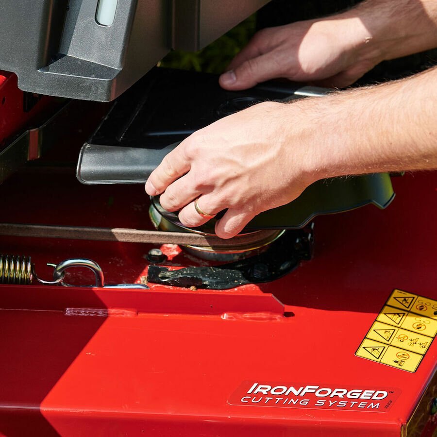 Toolless Belt CoverSimply unlatch the belt cover and easily sweep away debris to prevent deck corrosion and belt wear. |