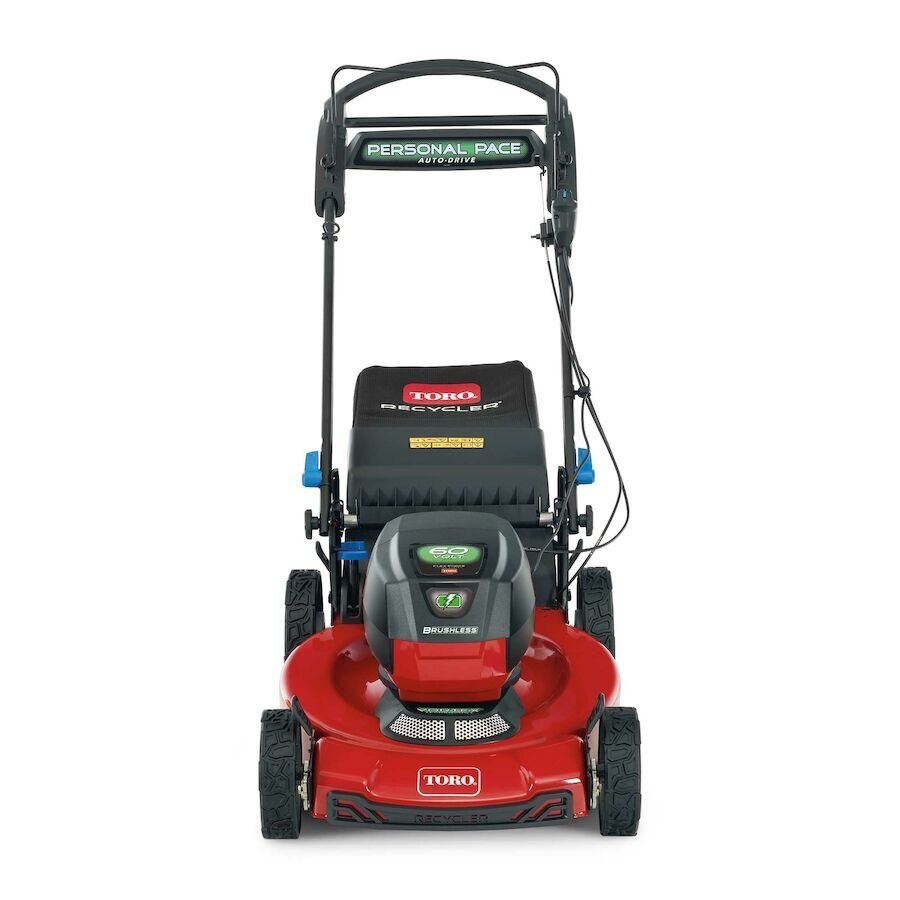Overview Introducing a mower that adjusts to you, with no knobs, no levers, no messing around. Grab the easy-to-steer handle, engage, and go - with Personal Pace Auto-Drive™. Supercharge your mowing with an amped airflow that requires less energy to cut more grass into teeny-tiny, clumpless clippings. That's our Vortex Technology™ giving you Lawn Vitamins™ for free. Throw on the grass bag and start your lawn vacuum that holds more so you empty less. In total, it's a boatload of features that easily make you and your lawn look great in less time. This 60-Volt* machine starts the first time, every time, and is built to last with a 22 in. steel deck.We've Got You Covered. Enjoy peace of mind with a 2-year full mower warranty mower and 3-year full battery. And as a Toro owner, you'll have access to nearly 4,000 servicing dealers across the U.S. and Canada ready to assist you. Count on it. *Battery manufacturer rating = 60V maximum & 54V typical usage. Actual voltage varies with load. |