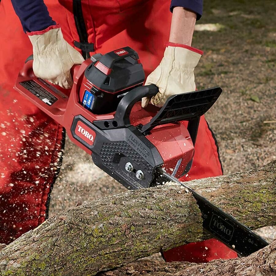 Tackle tough jobs with the new addition to the Toro 60-Volt* Flex-Force Power System collection, an easy-to-use, lithium-ion chainsaw that delivers incredible power and performance. It is compatible with all Toro 60-Volt Flex-Force Power System tools. The 60V Cordless Chainsaw with 16 in. bar and chain starts easily every time and lets you cut big logs and timber like a pro. With a long runtime—a single charge can make up to 50 cuts of a 6 in.x6 in. timber^ — you can get more done quicker, and the 60V digitally controlled brushless motor means you have more power right when you need it. Ideal for storm cleanup, tree trimming and log-cutting, this chainsaw makes outdoor work a breeze.