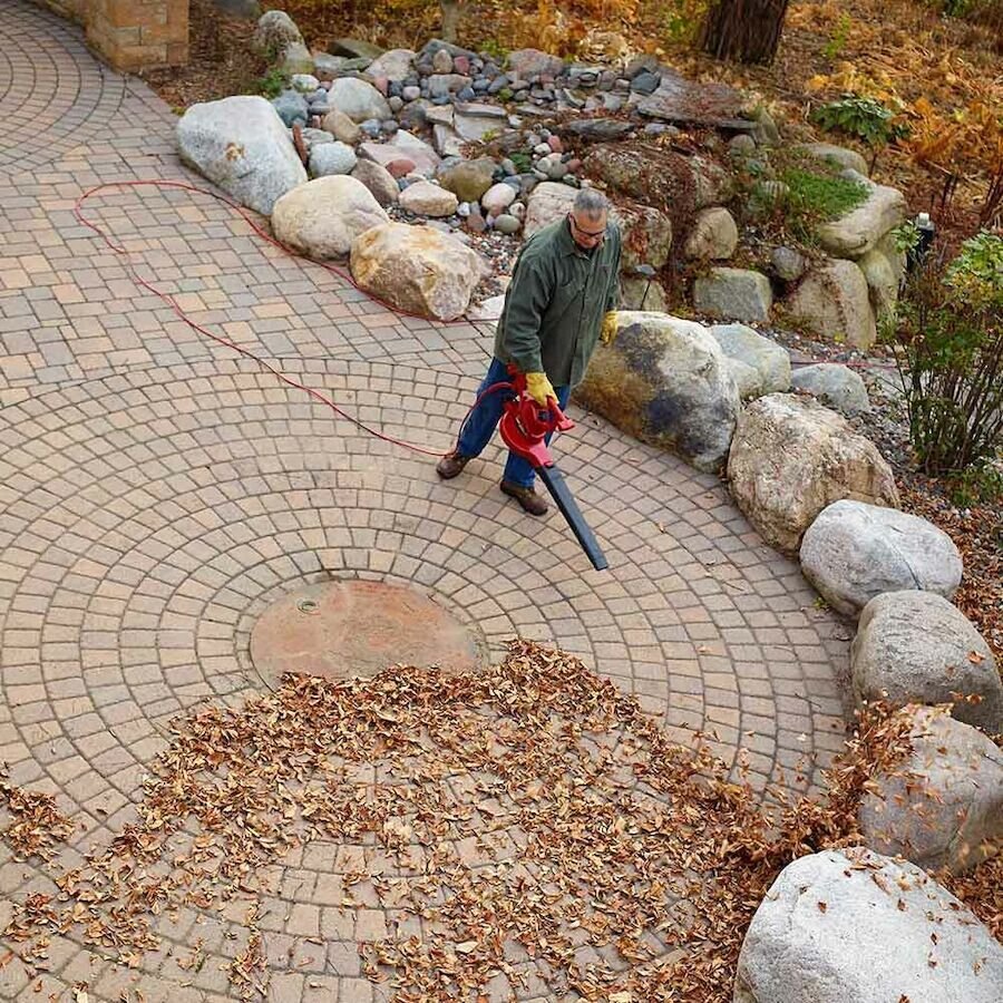 The metal blades on the impeller shred leaves and debris into fine mulch.