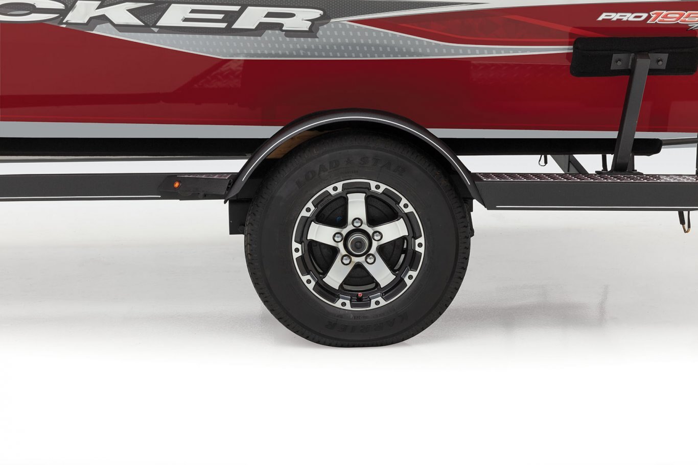 - Upgraded trailer w/custom aluminum wheels, full-size matching spare, 14" (35.56 cm) radial tires & bow boarding steps/safety handle for boarding from trailer