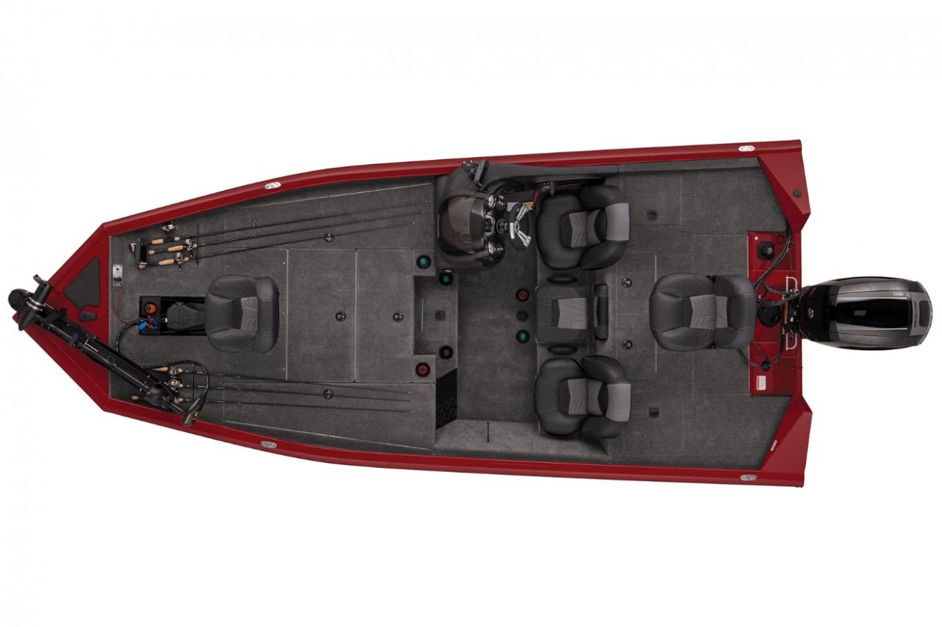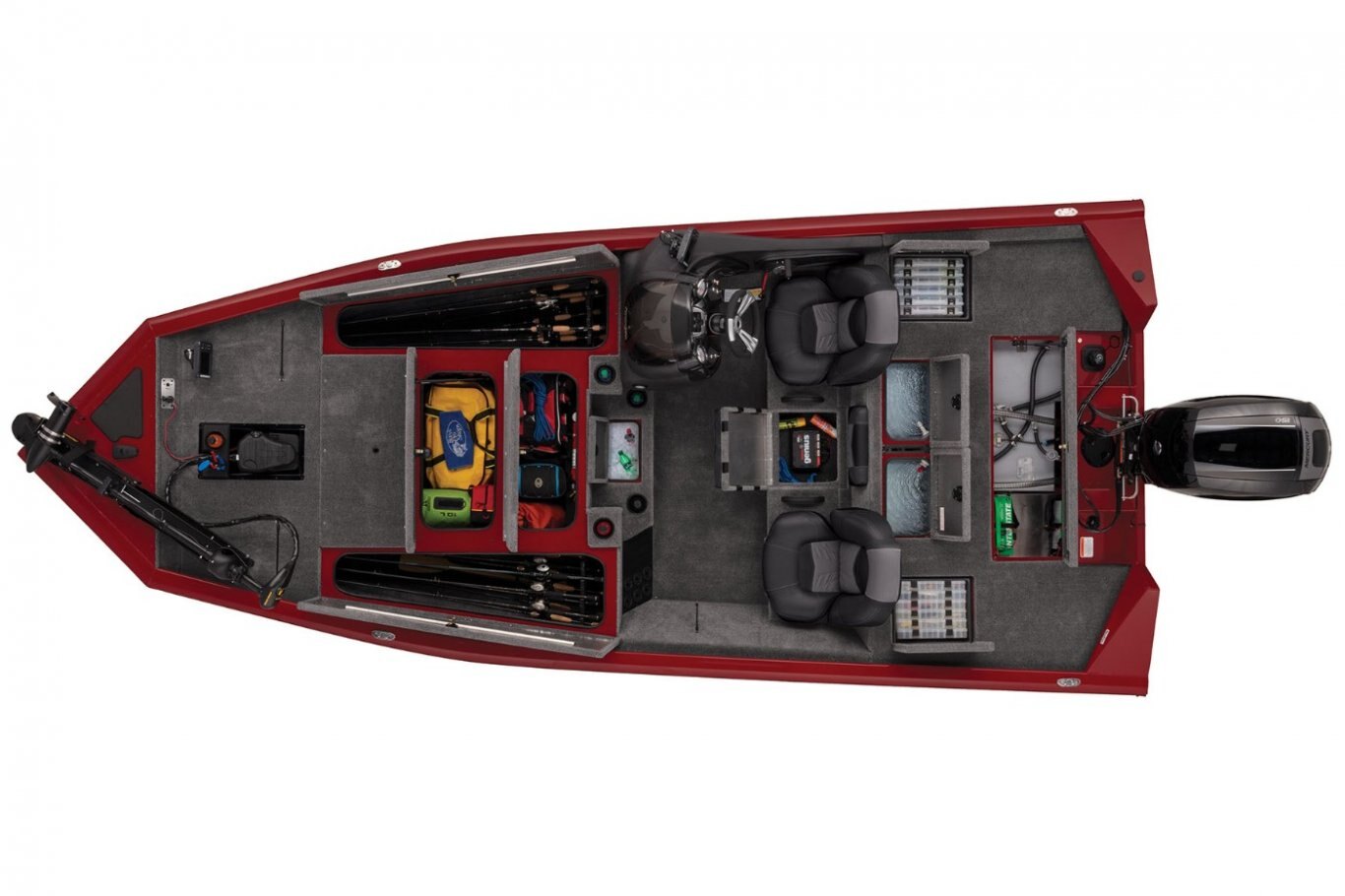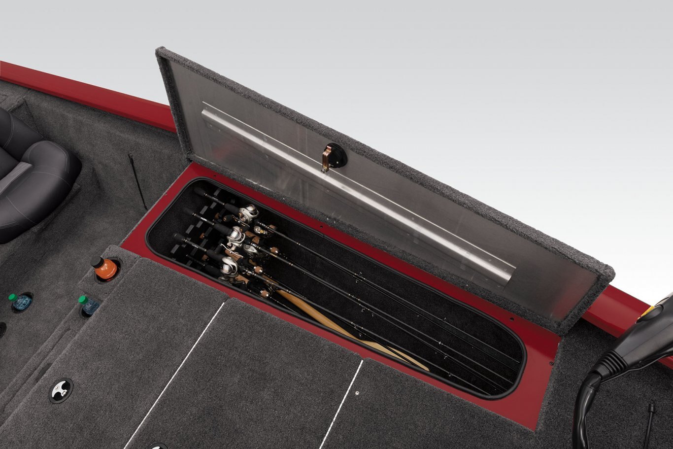- Port & starboard rod storage w/large lids & rod organizers w/tubes—24 total rods up to 9' (2.74 m) casting/8' (2.44 m) spinning