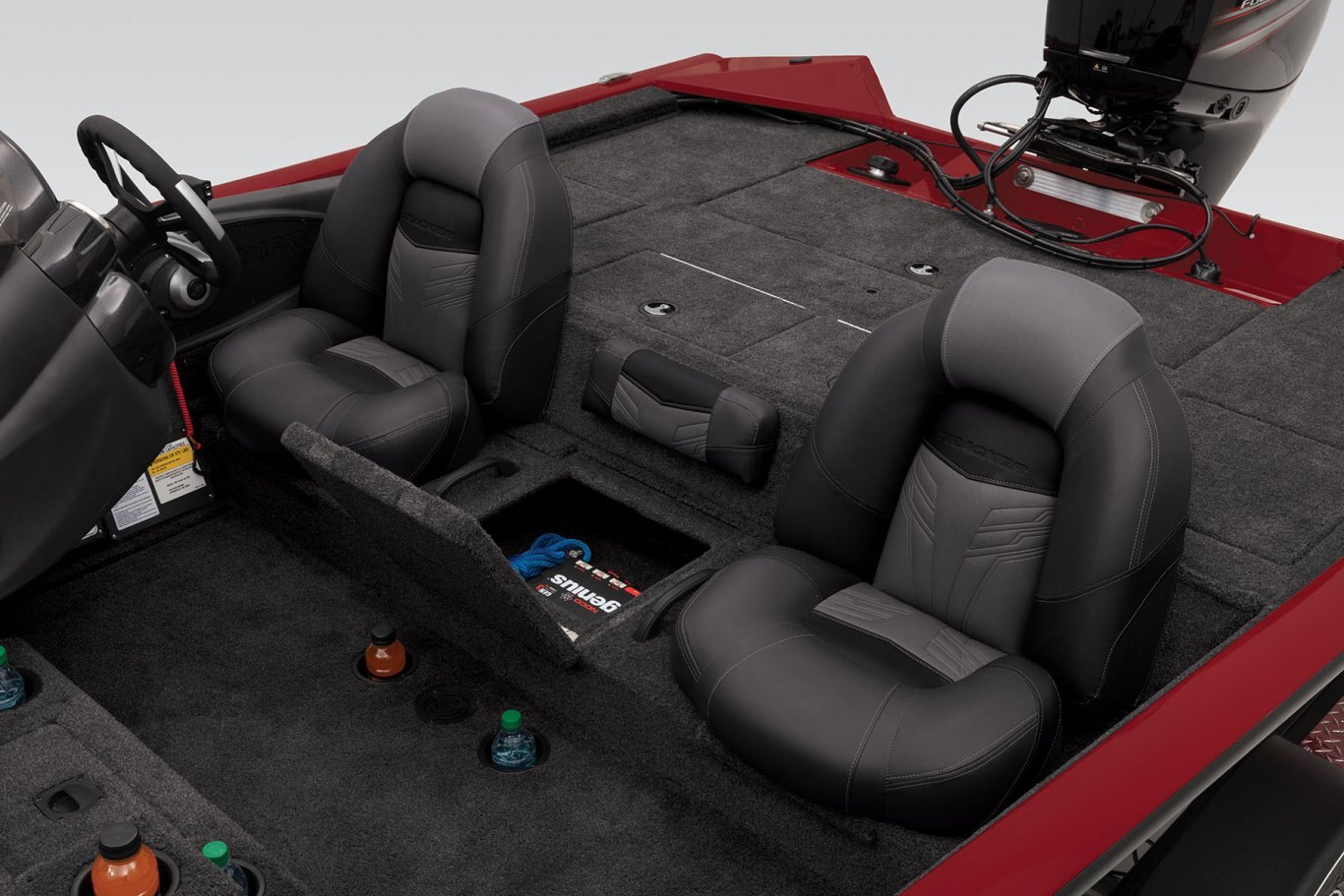 Interior - Tournament-style 39-sq.-ft. (3.62-sq.-m) elevated bow deck w/oversized dual rod boxes & center tackle organizer