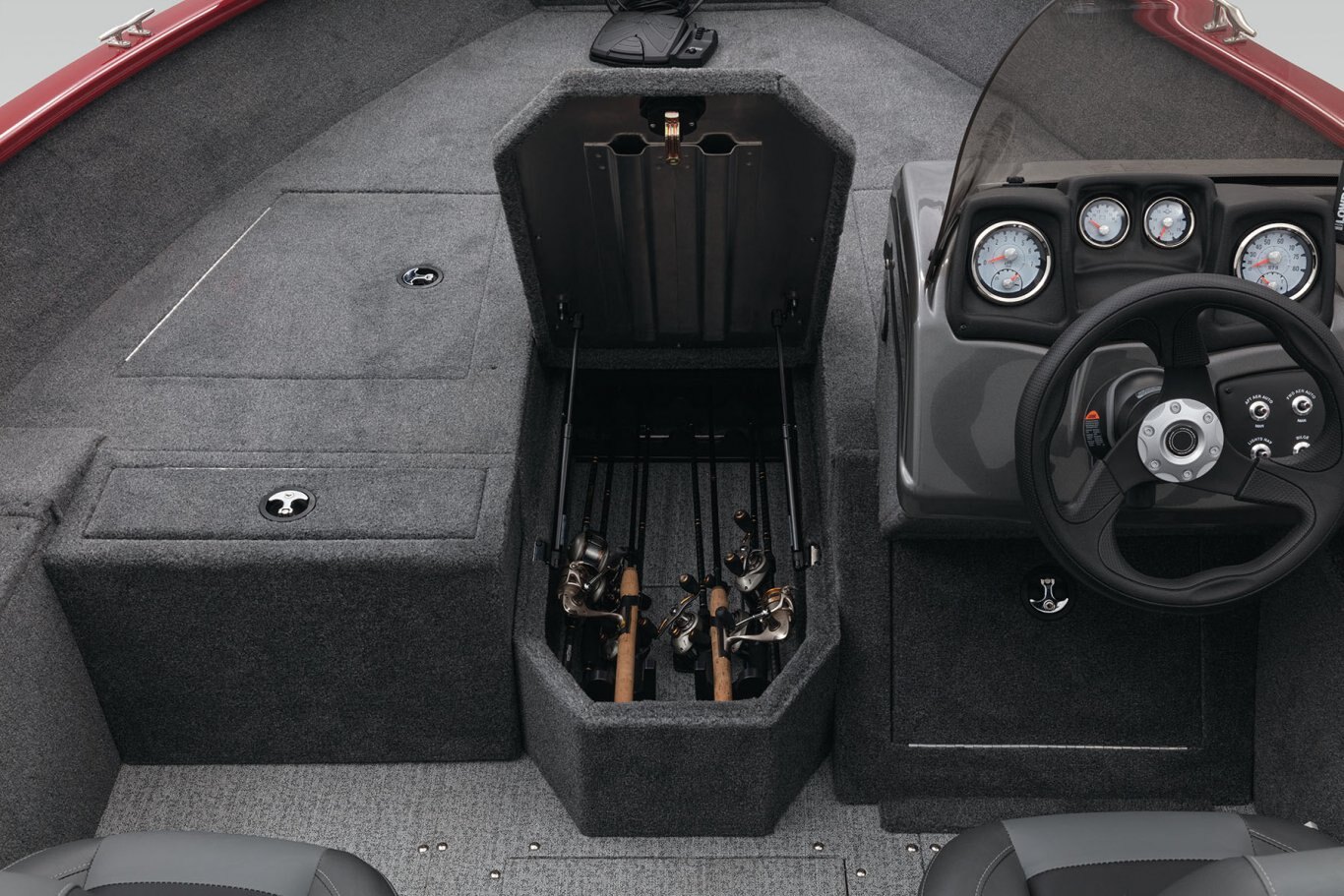 - Bow center lockable rod box w/organizer for spinning & baitcast rods to 7' 6" (2.29 m)