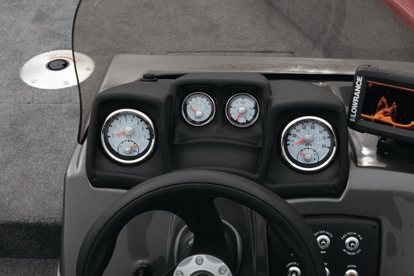 - Illuminated speedometer, tachometer, voltmeter, fuel gauge, water pressure gauge & trim gauge