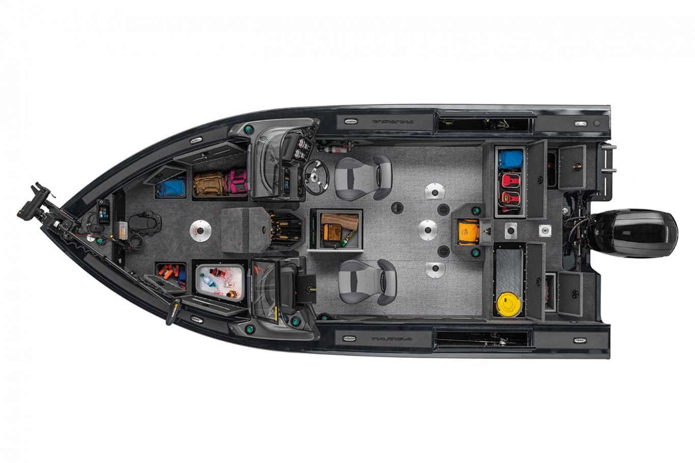 - Aft deck starboard rotomolded storage for fourteen 3700-series tackle boxes
