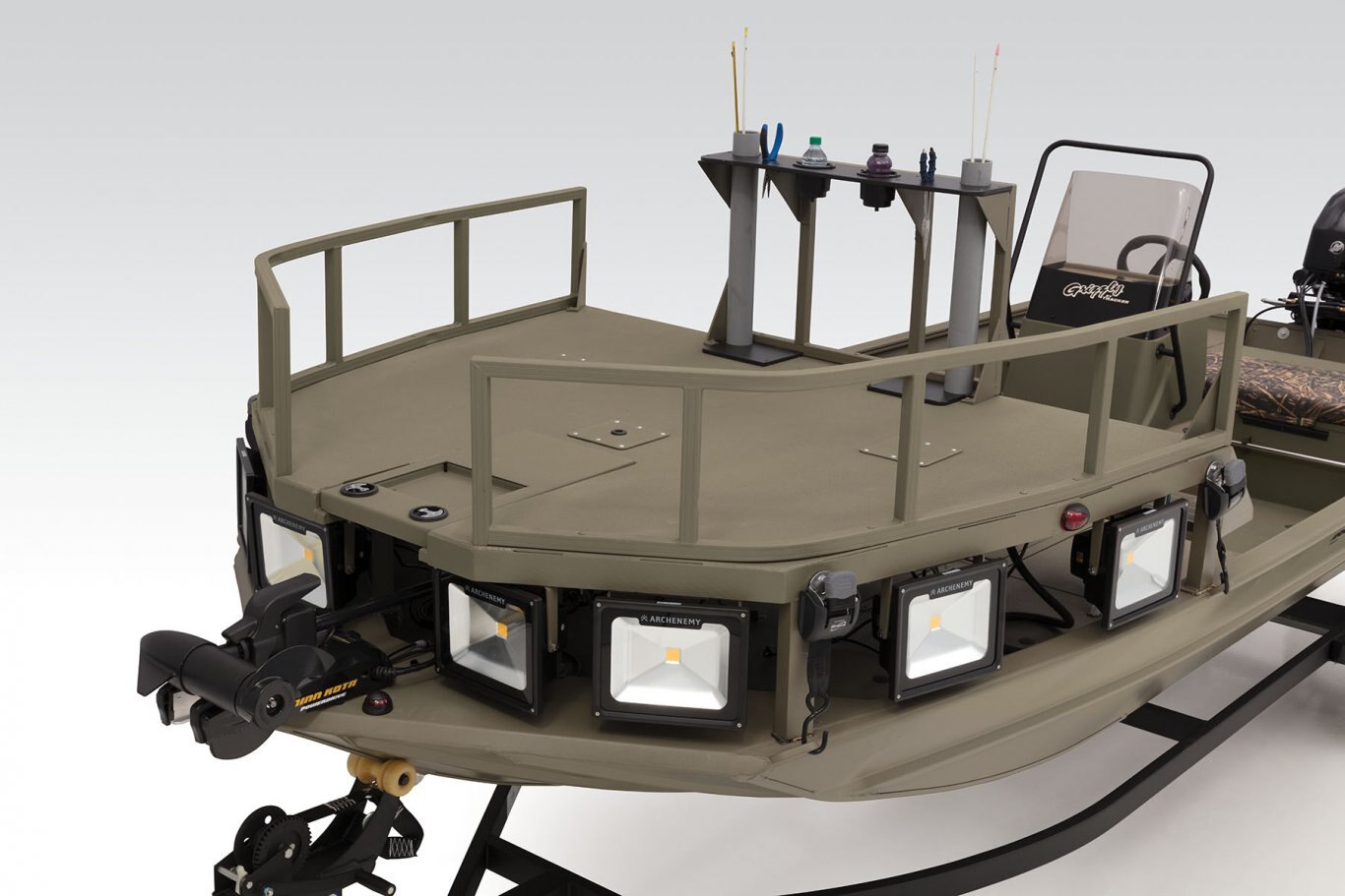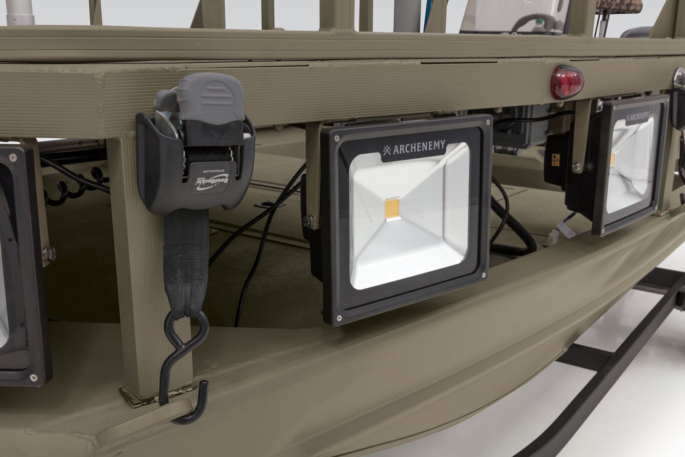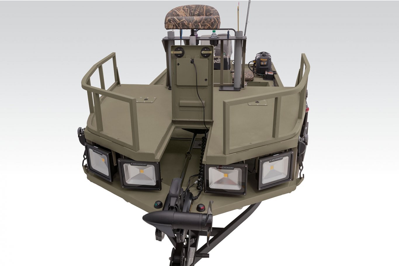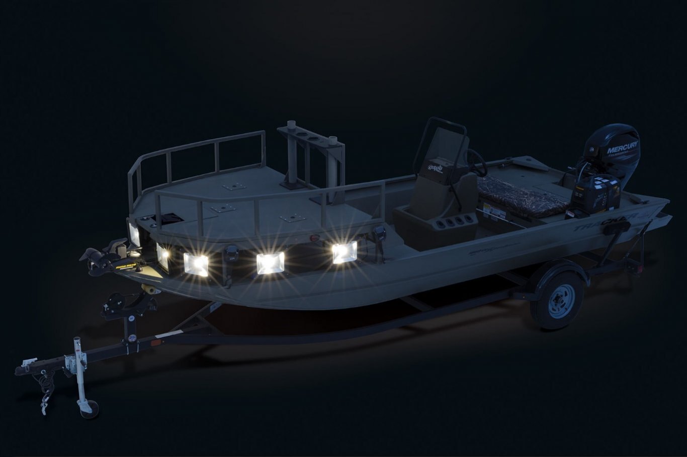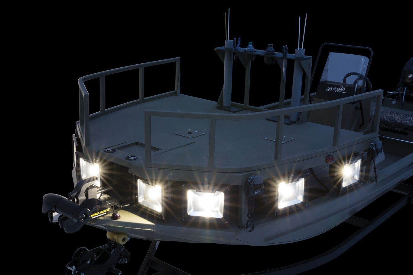 - Eight 50W, 5,000-lumen 120V A/C LED lights around the front deck to navigate & illuminate your prey