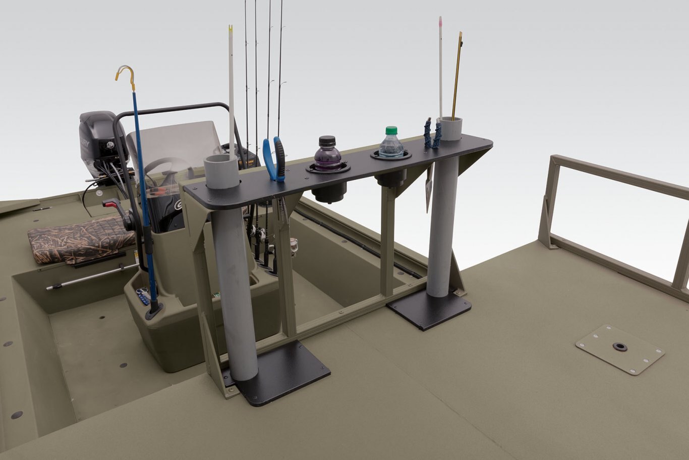 - Removable elevated bow shooting deck w/railing, rail-mounted bow & drink holder, 3 pedestal seat base locations, LED spotlights & trolling motor access hatch