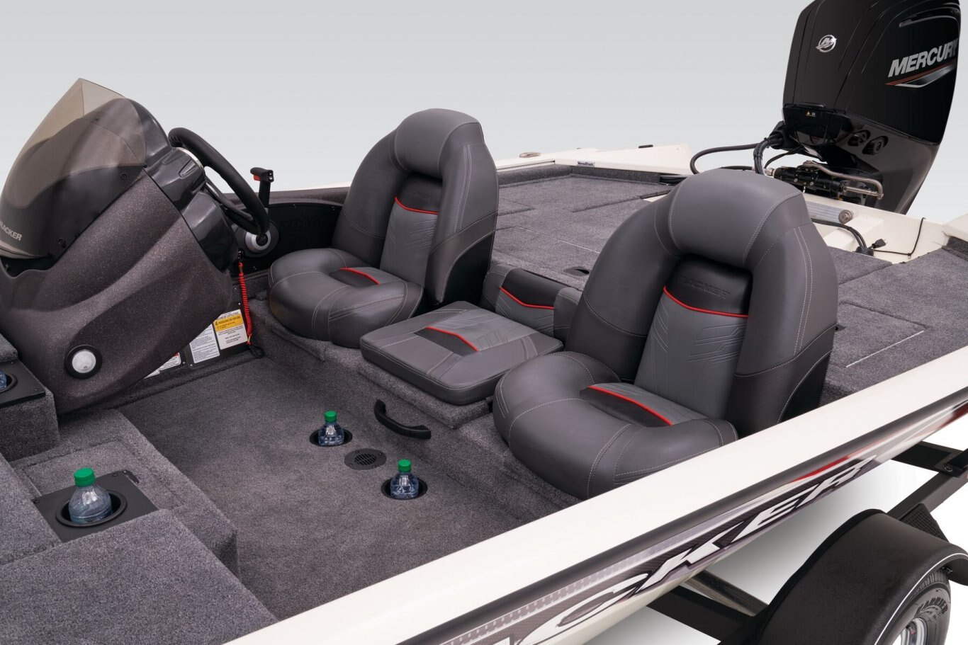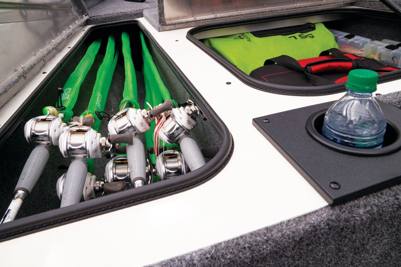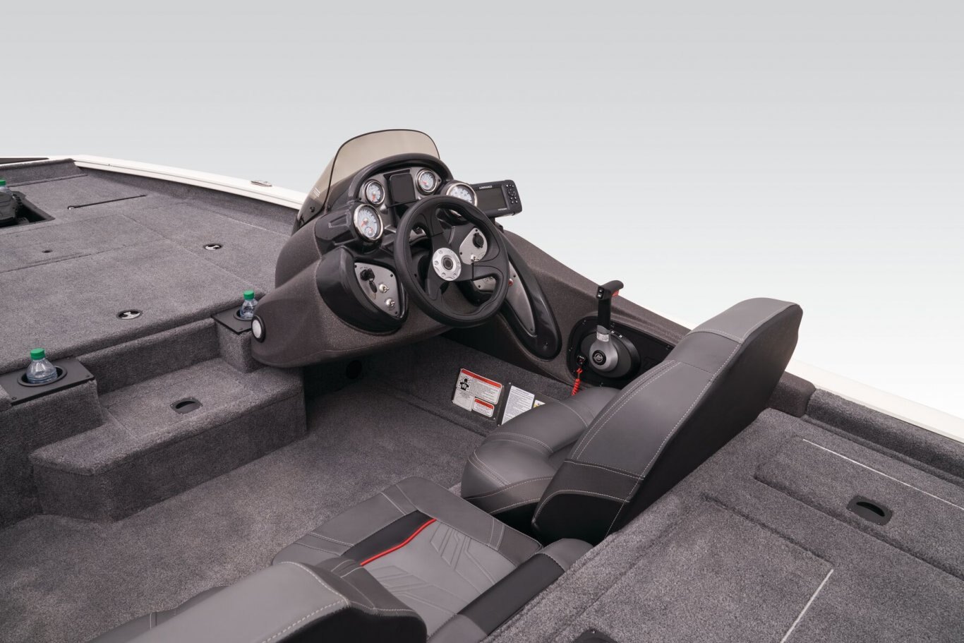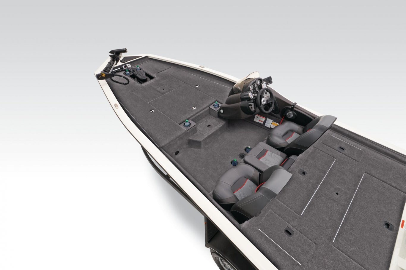 Tournament-style 32-sq.-ft. (2.97-sq.-m) elevated bow deck 2 pedestal seat base locations 100% composite fishing seats w/contoured hinges & snap-off cushions 2 folding fishing seats Bow center tackle organizers & tool/tackle holder Bow port & starboard rod storage w/large lids & rod organizers w/tubes—16 total rods up to 8' (2.44 m) casting/7' (2.13 m) spinning Bow storage ventilation to reduce condensation Bow deck rod hold-down strap 30-qt. (28.39 L) step cooler, box & lid 3-across cockpit seating w/storage below center Removable center cushion w/back bolster Elevated aft casting deck Aft port & starboard molded storage boxes each hold three 3700 tackle boxes Exclusive VERSATRACK® accessory-mounting channel in gunnels 16-oz. (.45 kg) marine-grade, fishing-friendly carpet throughout T-handle locks on all lockable compartments Interior color w/Dark Gray tones