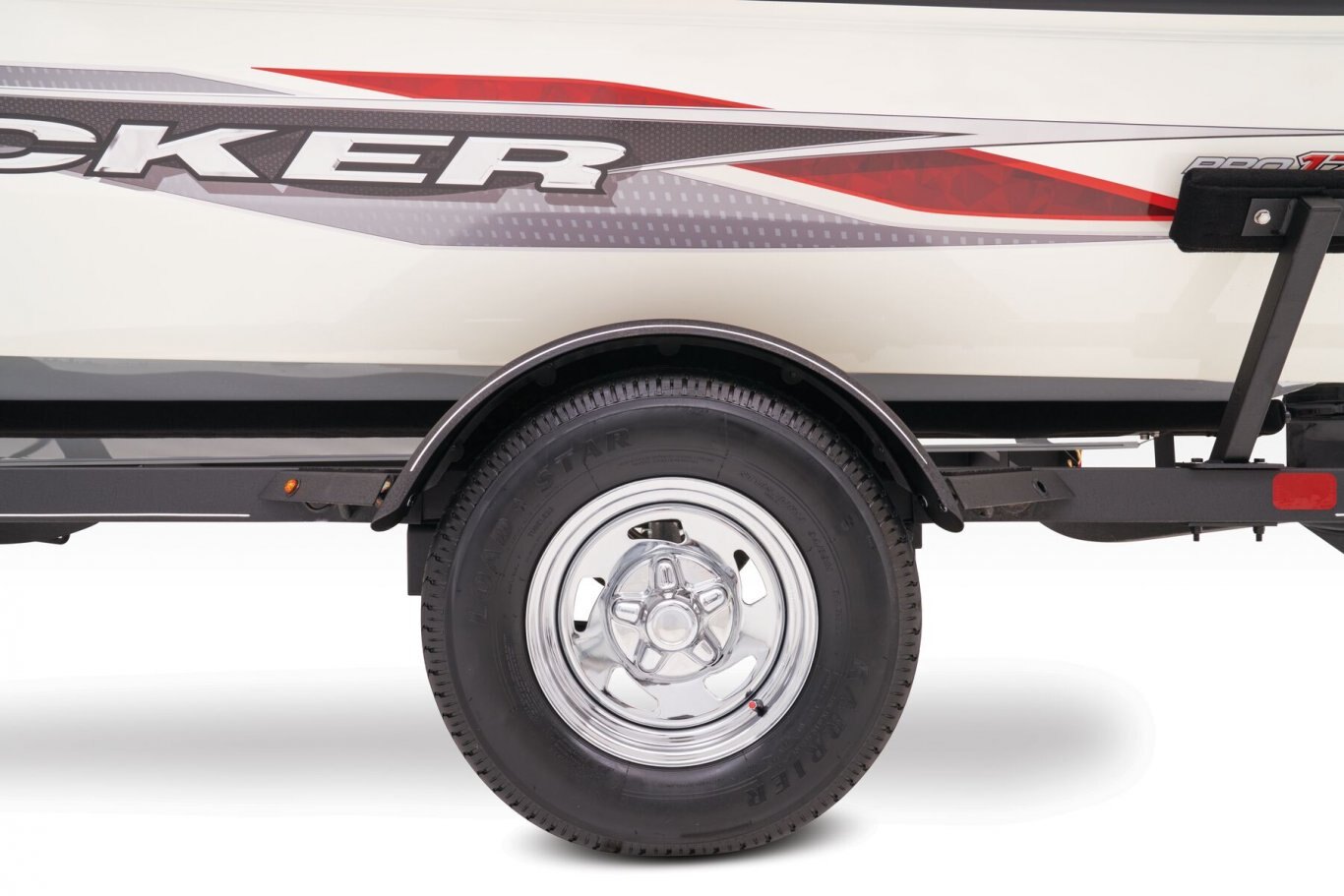 Custom-fit, single-axle trailer powdercoated w/GALVASHIELD® Impact corrosion & chip protection for improved durability Chrome wheels & matching hub covers w/13" (33.02 cm) radial tires Hubs designed for quick & easy hub lubrication Space-saving swing-away tongue to reduce storage length Pivot-up locking jack w/swivel wheel Heavy-duty winch w/nylon strap & bow safety strap Outboard motor support to reduce hull & transom stress while towing Heavy-duty upright load guides for easy, centered loading Carpeted bunks & fender boards to protect hull Submersible LED lighting Nylon tie-down straps (supplied w/boat package) Safety cables