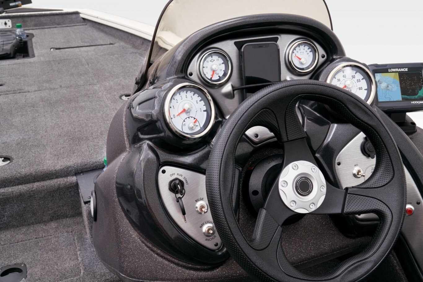Lowrance® HOOK2 5 Reveal swivel color fishfinder w/SplitShot™ transducer & GPS Soft touch sport steering wheel Single-cable, no-feedback rotary steering 1-piece rotomolded console w/tinted windscreen & mobile phone holder Multifunction speedometer/fuel gauge & tachometer/trim gauge Voltmeter & water pressure gauge Silver switch panels Mercury® control box Stardust console color