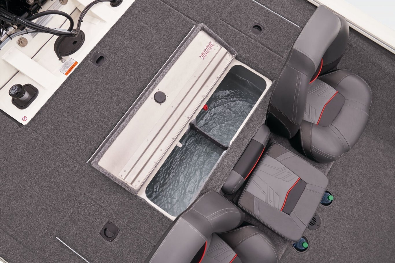Aft 21-gal. (79.49 L) aerated livewell w/divider, timer, recirculator, pump-out system & oversized overflow drain 500 GPH (1,892.71 LPH) aerator/fill pump & 500 GPH (1,892.71 LPH) recirculating pump w/timer Molded 1-piece construction w/rounded corners for easy cleanup & to protect your catch
