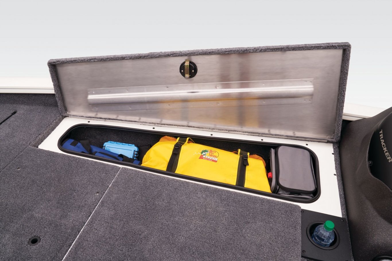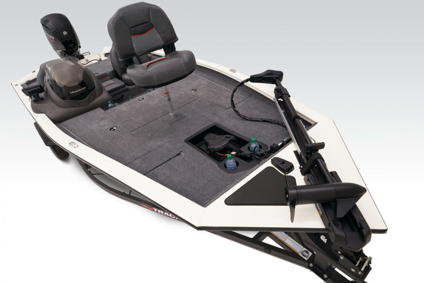NEW TRACKER® 45th Anniversary badging Color: DIAMOND COAT™ Starlite Red, TRACKER® Black or TRACKER® White gunnels & hull sides w/Starlite Gray bottom DIAMOND COAT™ 2.0 finish features industry-exclusive powdercoat & clearcoat for brilliant durability Rugged, all-welded, 2-piece aluminum hull w/pressed-in strakes & chines for structural strength & handling All-welded .100 aluminum hull Robotically welded, all-aluminum box-beam transom w/corner braces welded in to unitize & strengthen the hull Welded-in longitudinal stringer system for full-length support along the running surface Expanding foam injected into hull cavities for added hull stiffening, flotation & a quieter ride 4" (10.16 cm) extruded 1-piece gunnels w/rub rail insert for structural strength, rigidity & side protection Pressure-treated floor & decks w/limited lifetime warranty All compartment lids are flush-mount, carpeted & all-aluminum for structural rigidity, tight fit & long-term durability Weather-resistant lid design w/rubber molding to keep your gear drier