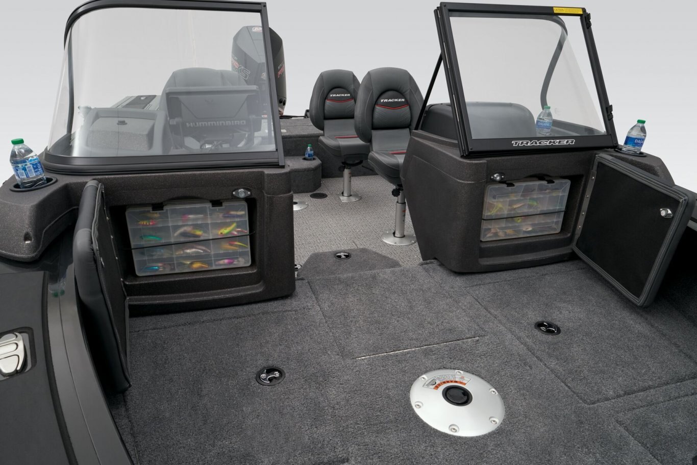 - Port & starboard rotomolded consoles w/walk-thru windshields & hatch