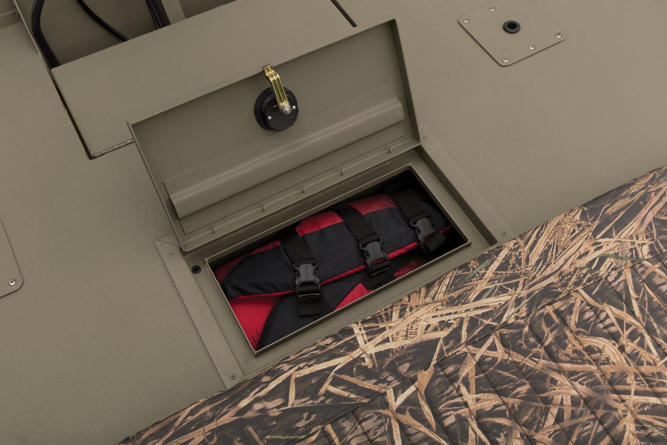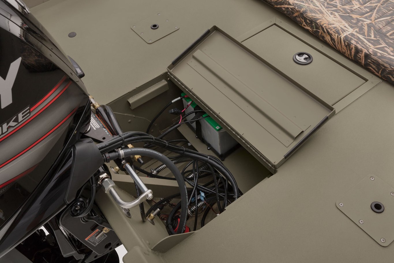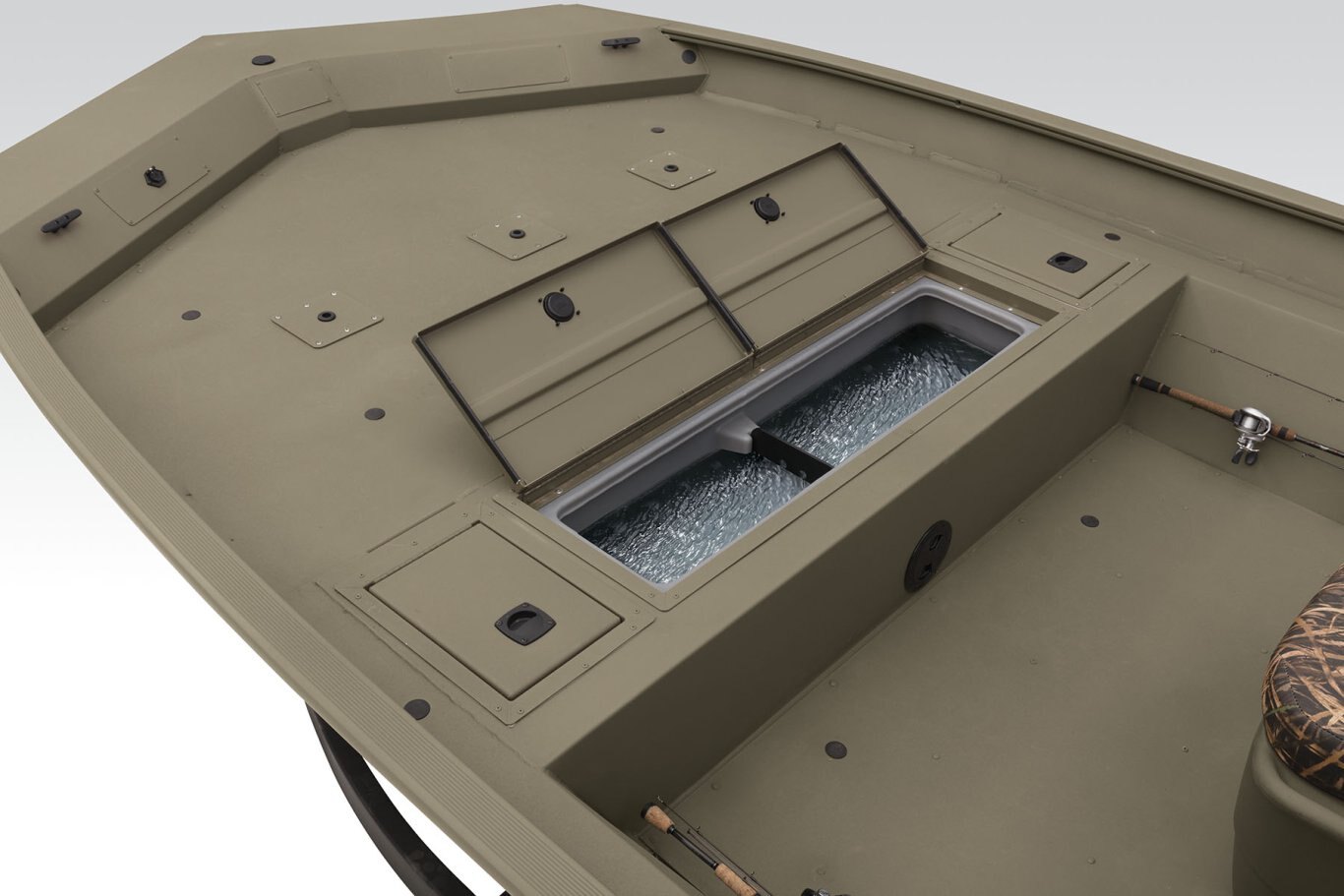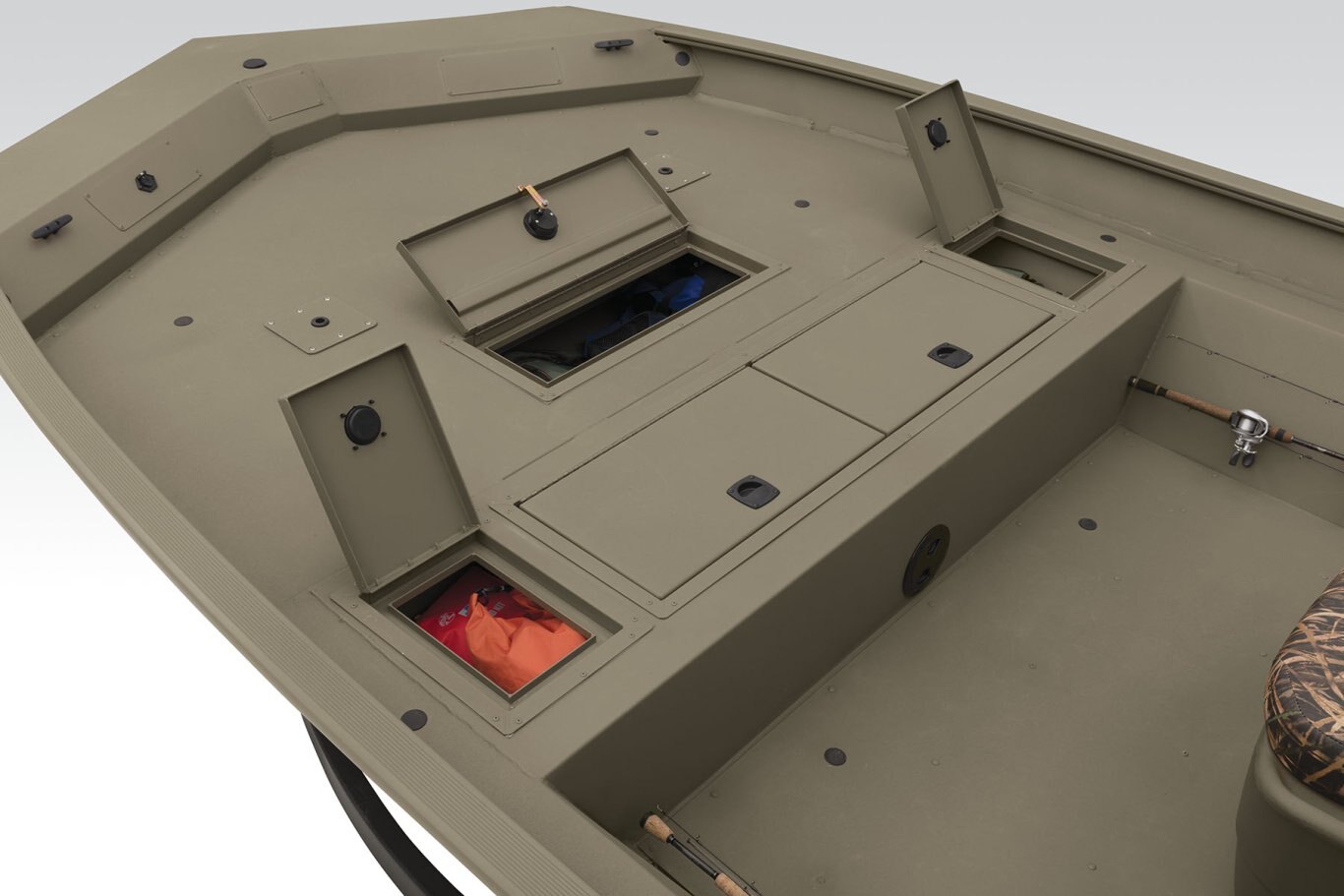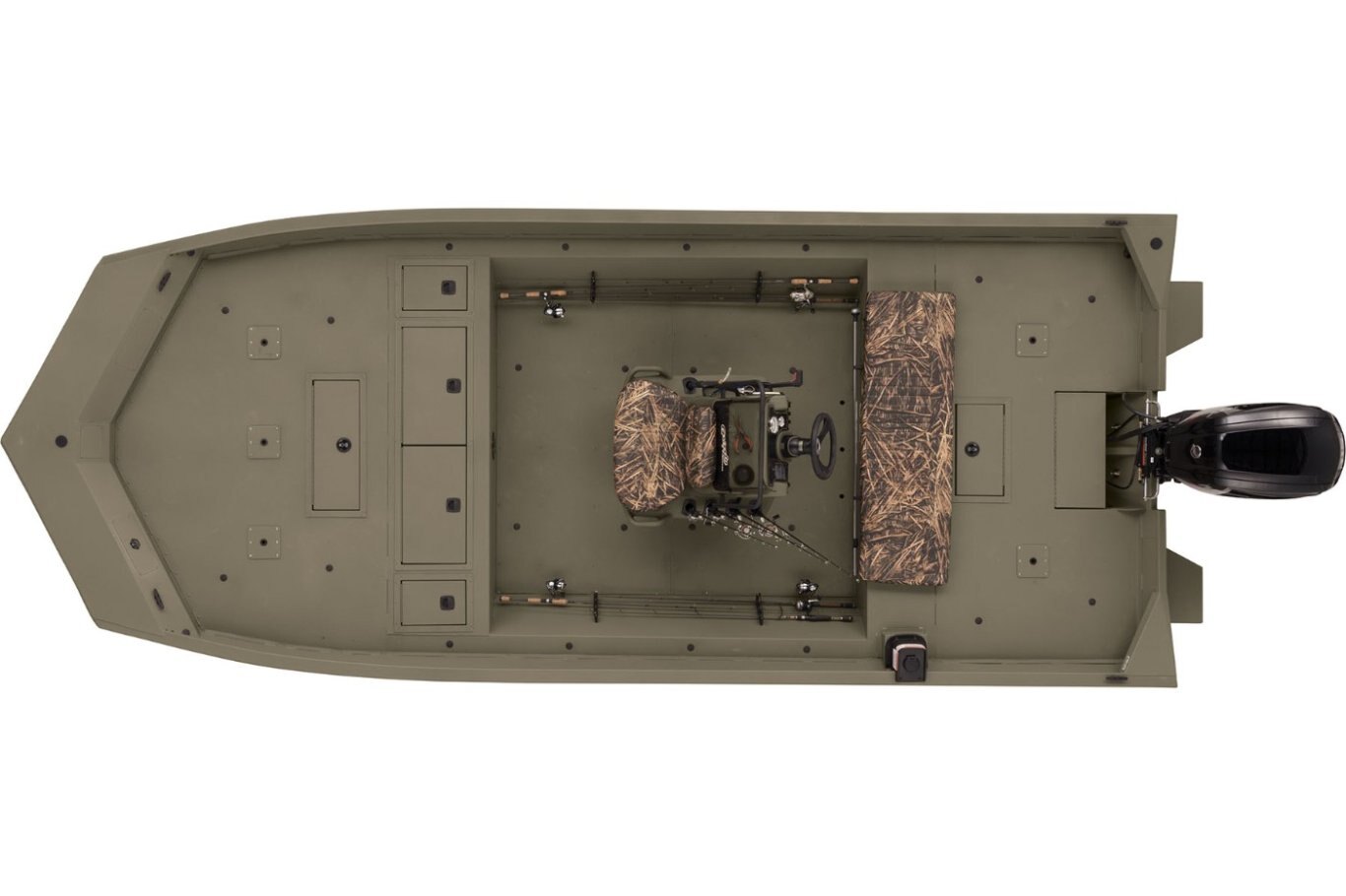 Roomy front deck w/more space for fishing/hunting 3 bow deck & 2 aft deck pedestal seat base locations Bow deck lockable storage Port & starboard side rod holders Padded helm cushion w/TrueTimber® DRT camo Lockable aft deck storage Sure Tread™ non-skid interior