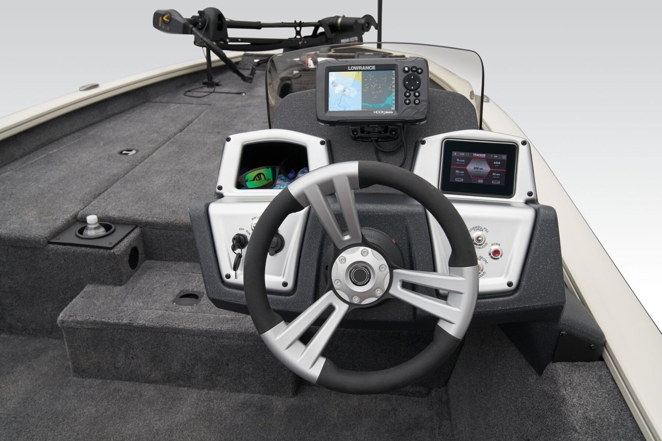 • NEW 1-piece rotomolded TRACKER® console w/built-in controls, storage pocket & windscreen