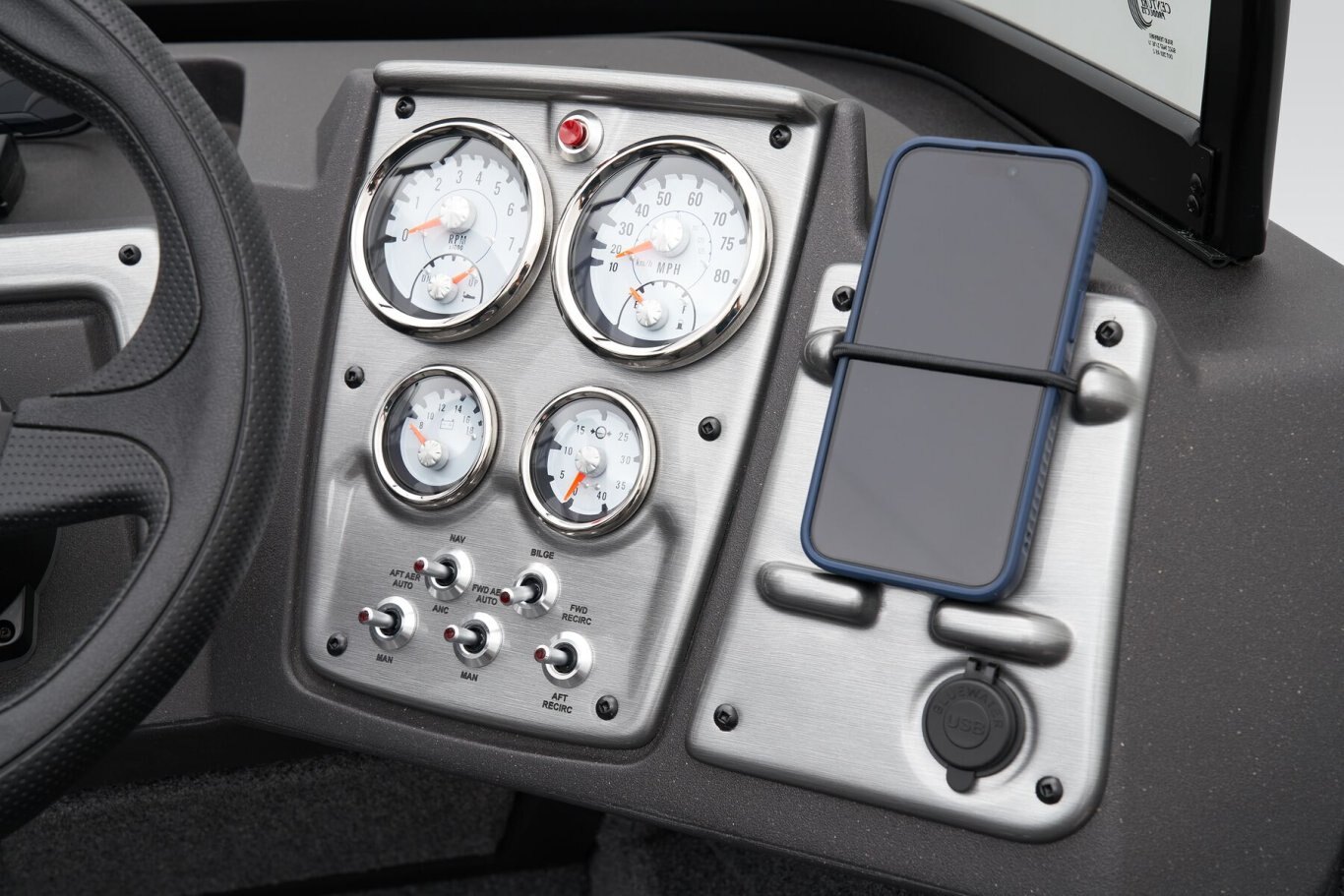 - Illuminated speedometer, tachometer, voltmeter, fuel gauge, water pressure gauge & trim gauge