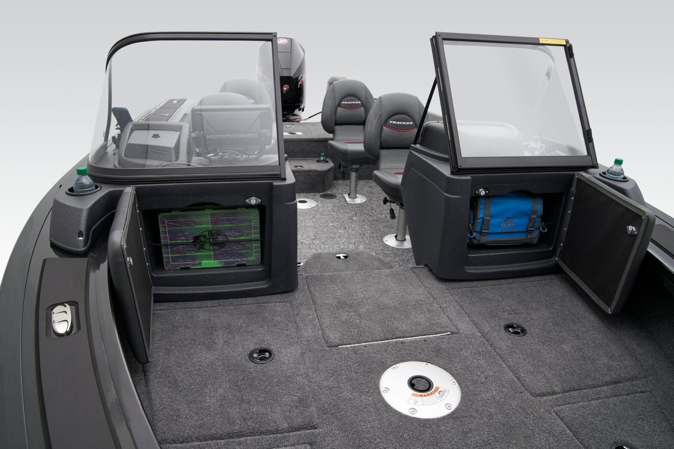- Aft deck starboard rotomolded storage for fourteen 3700-series tackle boxes
