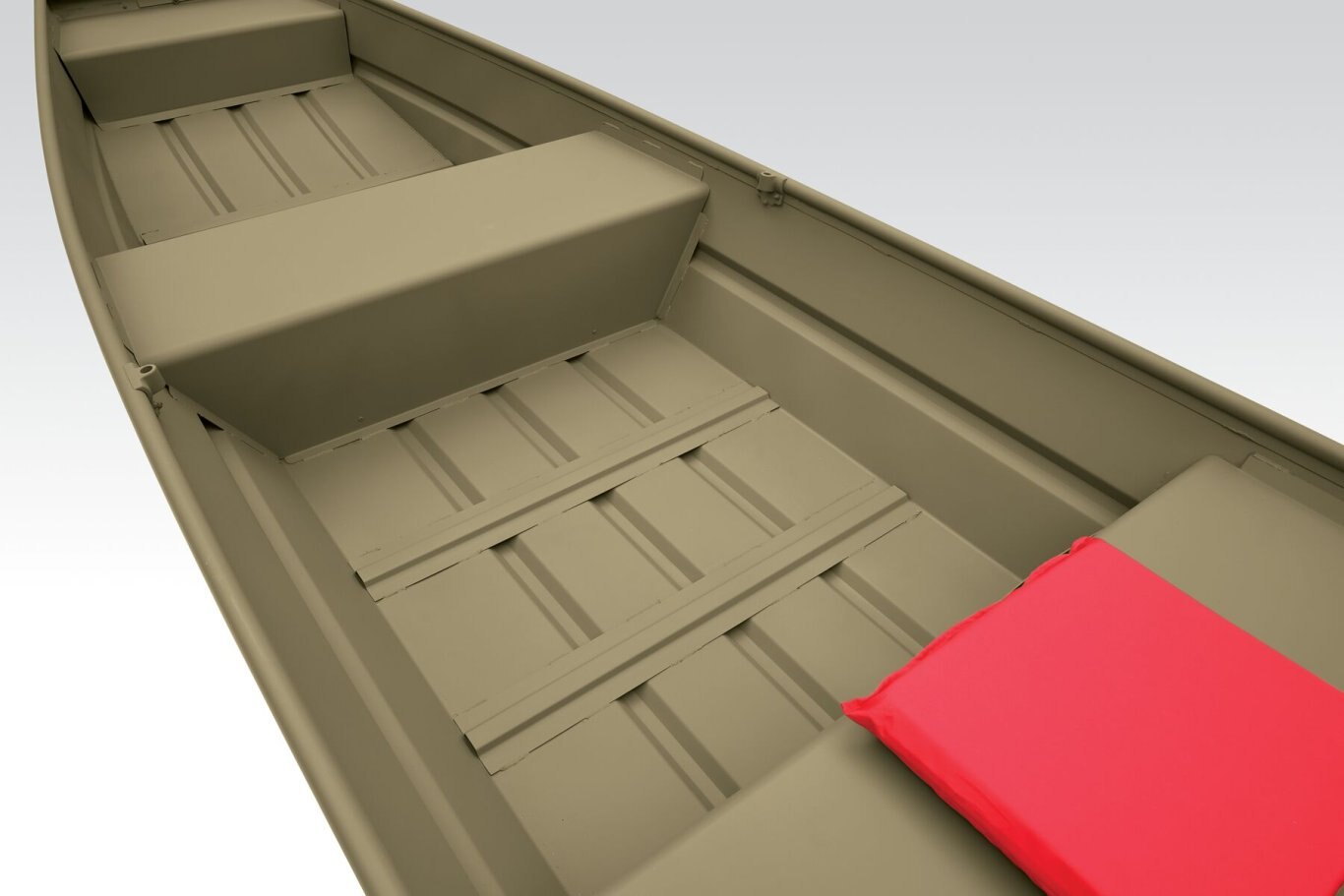Introducing the TRACKER GRIZZLY 1436 jon boat, an agile aluminum vessel crafted to comfortably host three anglers. Emphasizing the all-welded hull design, the TRACKER GRIZZLY 1436 sets a new standard in durability and performance. Unlike riveted hulls that may develop vulnerabilities over time, the all-welded construction of the GRIZZLY 1436 ensures a solid and seamless framework, enhancing longevity and reliability. Whether tackling challenging waters or cruising leisurely, the all-welded hull design guarantees a secure and enjoyable boating experience, making the GRIZZLY 1436 a top choice for adventurous anglers. Reinforced with aft foam boxes and corner braces at the transom, this boat is engineered to thrive in rugged terrains, whether embarking on a dusty trail to your secluded fishing haven or enjoying a serene day on the water. The GRIZZLY 1436 features center and aft bench seats, complemented by a spacious bow platform, offering ample space for gear storage and ensuring a cozy fishing experience for all occupants.