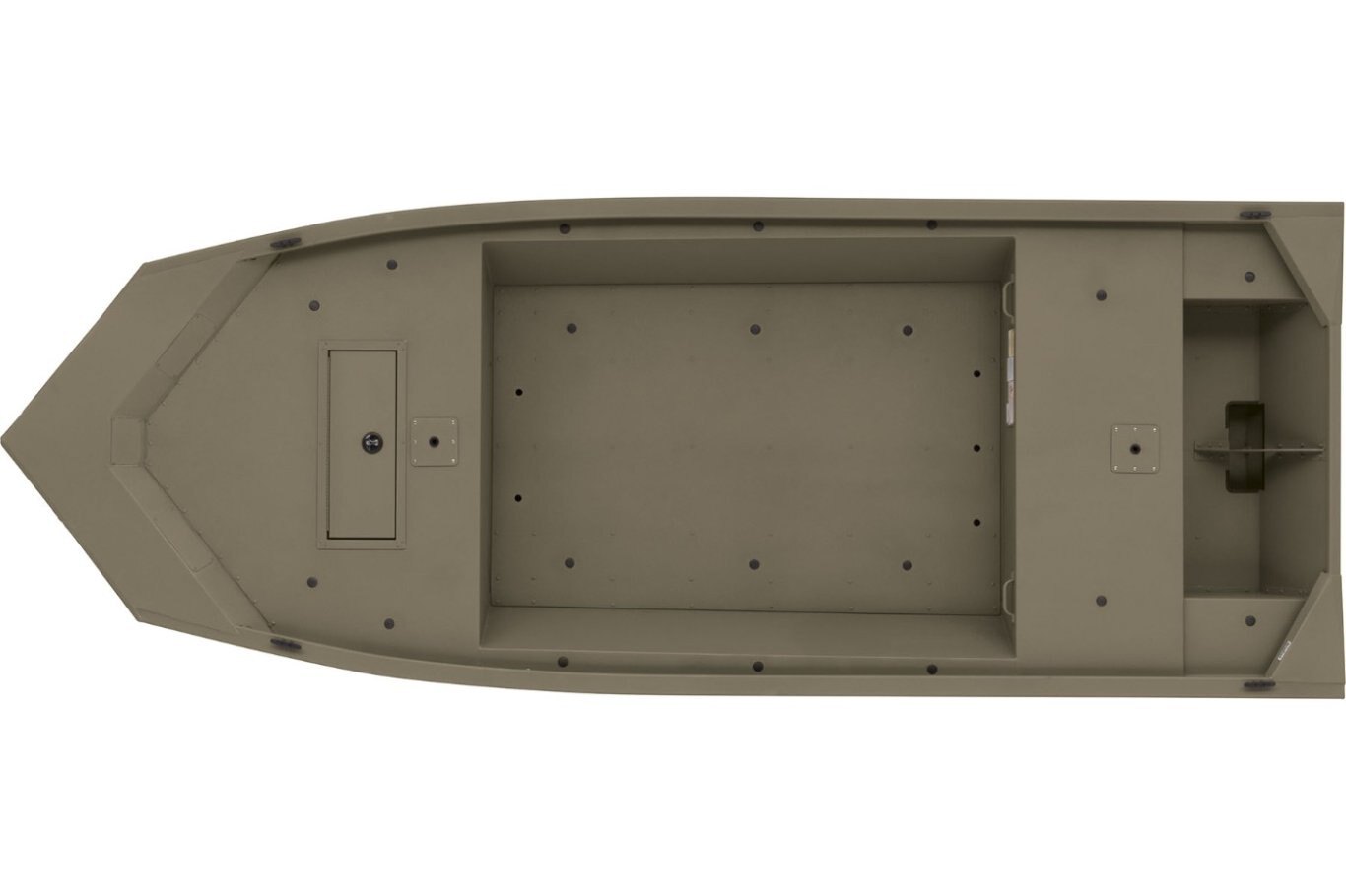 Color: Forest Green Available in optional Grassland or Woodland camo patterns (at additional cost) Industry-exclusive, baked-on powdercoat finish w/Sure Tread™ for long-lasting durability, color & good looks 100% aluminum, wood-free construction Thick .190 aluminum floor for added rigidity & a quieter ride 7° deadrise for a smoother, drier ride Welded-in, foam-filled interior side walls for quieter ride & structural strength Heavy-duty 1-piece, extruded aluminum gunnels for structural strength & rigidity Extruded bow chines for a stronger hull 2-piece, .100 5052 marine grade aluminum hull All-aluminum box-beam transom w/corner braces—welded in to unitize & strengthen the hull Welded-in longitudinal stringer system for full-length support along the running surface Pressed-in strakes for structural strength & tracking stability Welded, drained rain channels for drier storage in bow compartment(s)