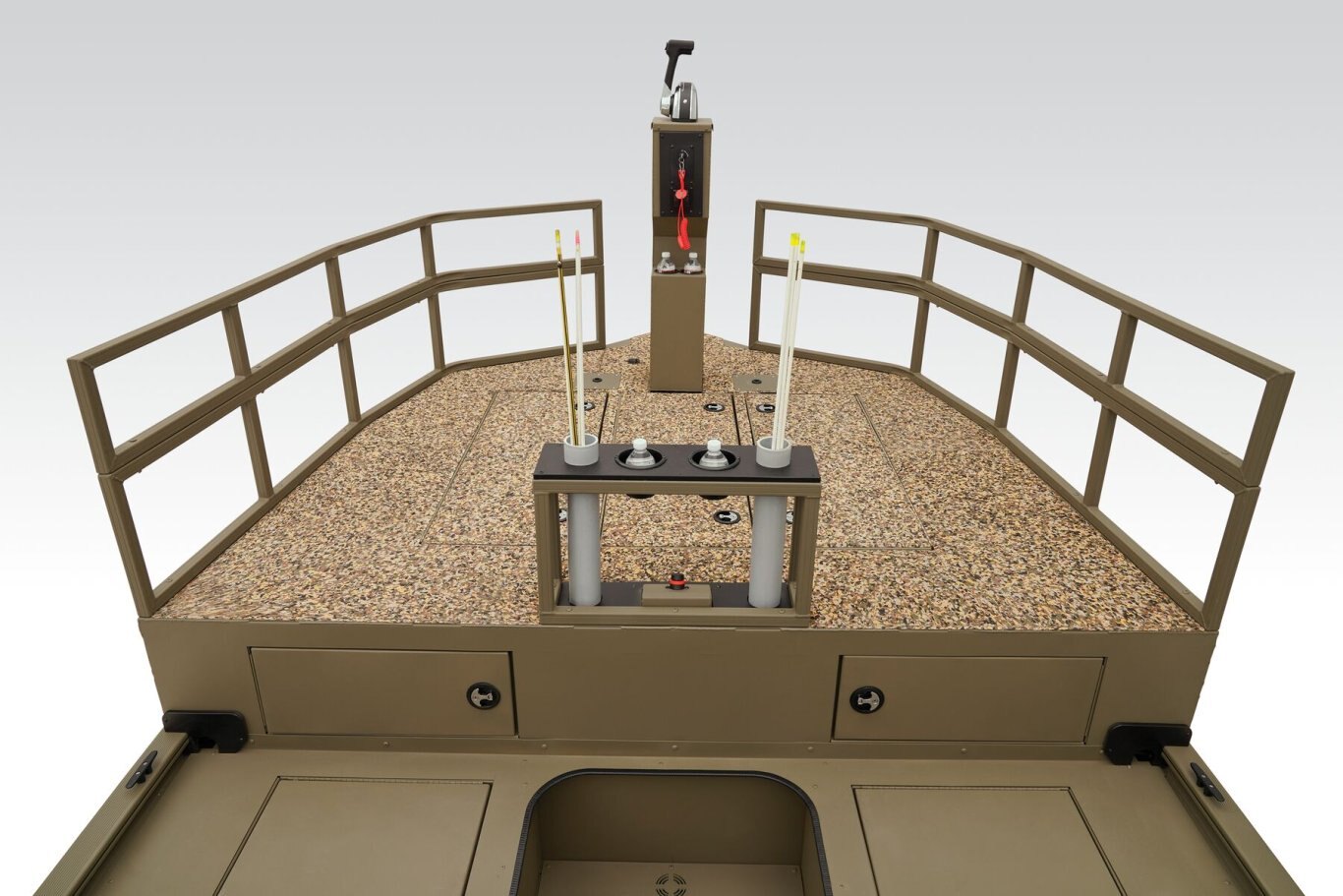Interior - Fixed & elevated bow shooting deck w/railing, rail-mounted utility tray w/arrow, tool & drink holders, 2 pedestal seat base locations, 160W Outrigger Outdoors® bowfishing lights & under-deck storage compartments
