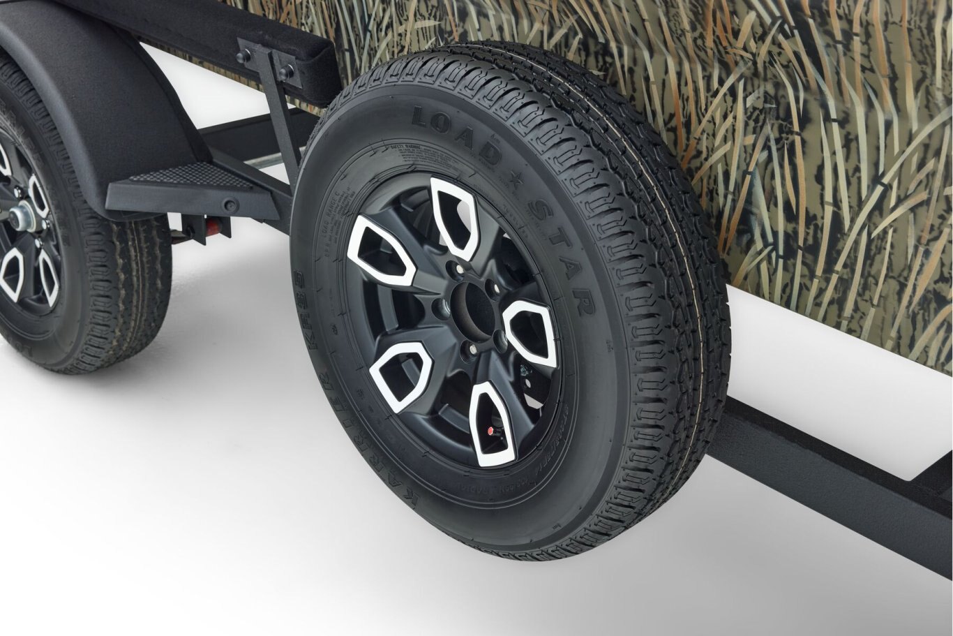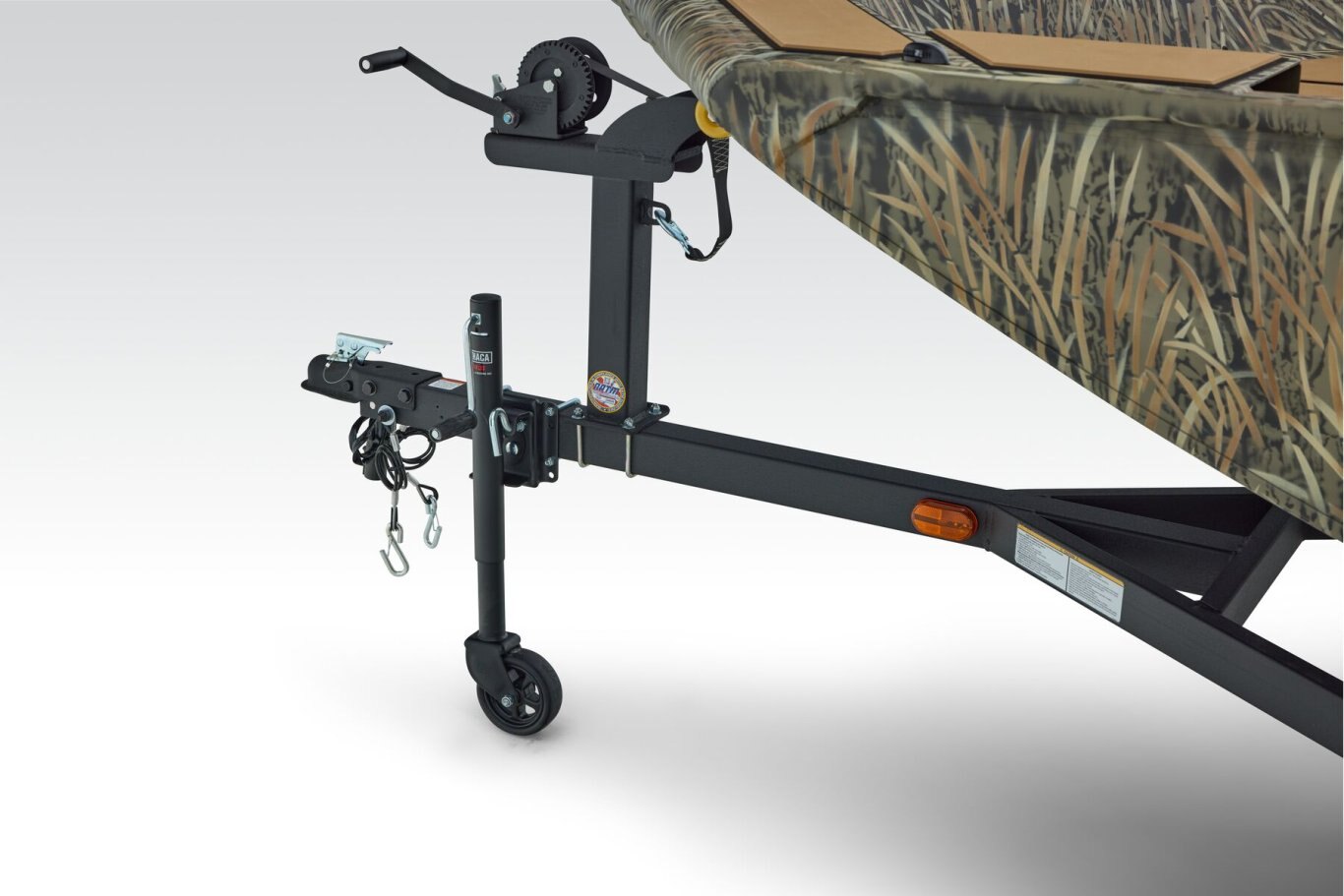 Trailer Custom-fit, single-axle trailer powdercoated w/GALVASHIELD® Impact corrosion & chip protection for improved durability 14" (35.56 cm) aluminum wheels/tires w/matching spare Hubs designed for quick & easy hub lubrication Pivot-up locking jack w/swivel wheel Heavy-duty winch w/nylon strap & bow safety strap Outboard motor support to reduce hull & transom stress while towing Heavy-duty upright load guides for easy, centered loading Carpeted bunks to protect hull Submersible lighting Nylon tie-down straps (supplied w/boat package) Safety cables
