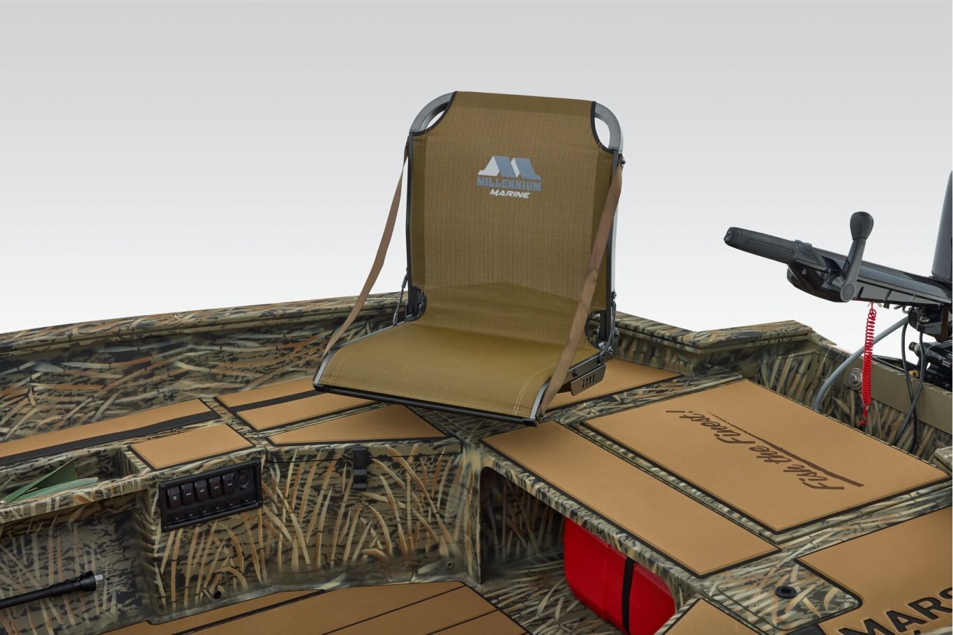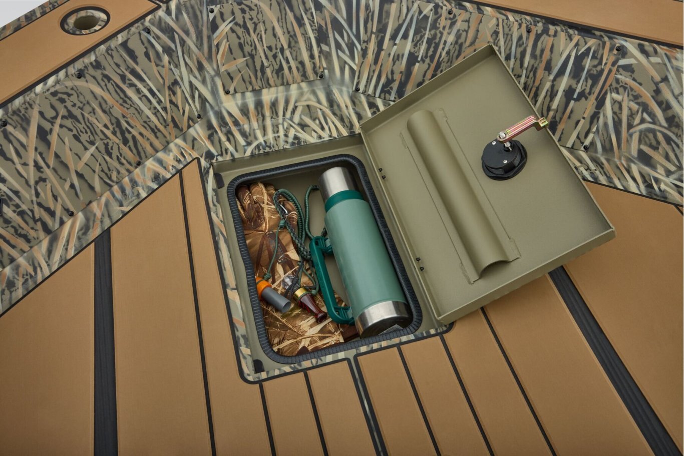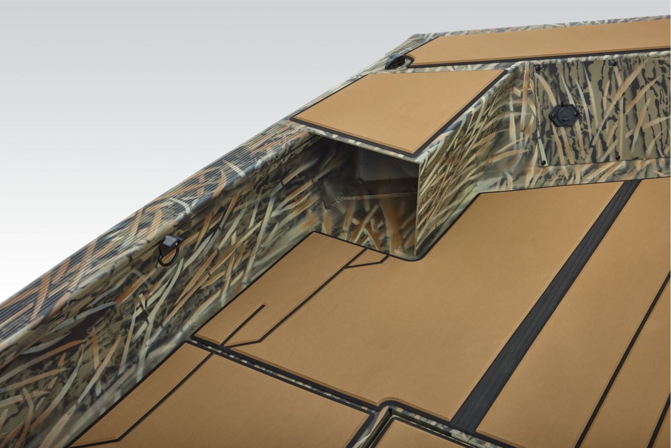 Designed for versatility, it features a spacious front deck ideal for duck hunting, multiple lockable storage compartments, and dry storage in the aft port seat pod. The interior includes Sure Tread™ non-skid flooring for safety and longevity, along with strategically placed tie-down points for gear security. The exclusive VERSATRACK® accessory channel allows customization. Constructed from 100% aluminum with a wood-free transom system, it provides a smooth, dry ride thanks to its 7° deadrise and icebreaker keel. Additional features include integrated spud pole tubes, rear transom steps, and a welded foam-filled interior for strength. Equipped with practical electrical components and a powder-coated trailer, this boat is perfect for die hard waterfowl hunters, and outdoor enthusiasts seeking durability and style in striking Forest Green or TrueTimber® camo patterns.