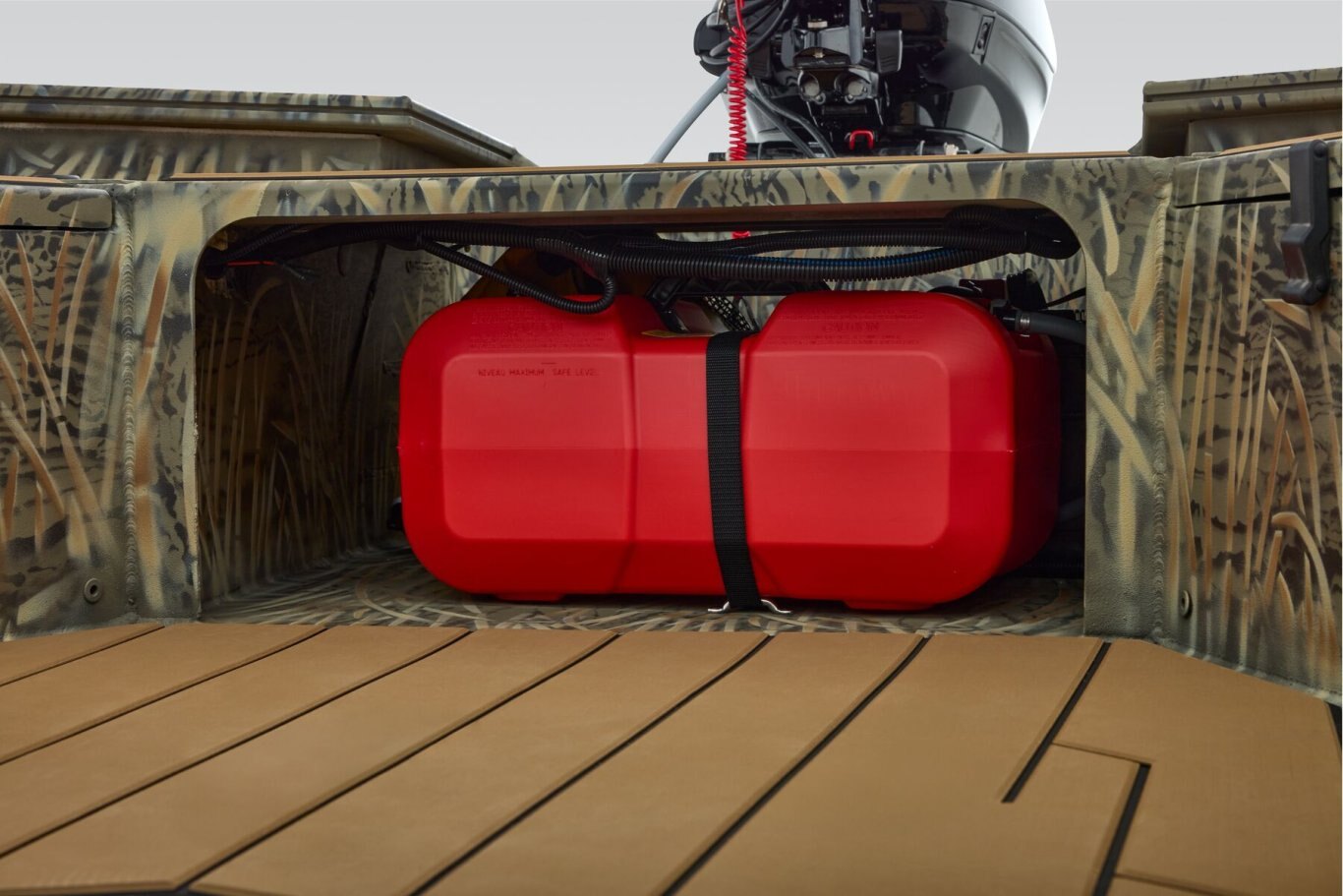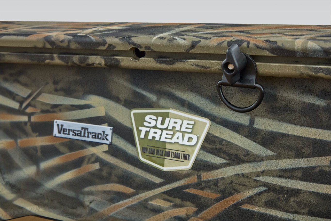 Interior Roomy front deck w/more space for fishing/hunting Bow & aft pedestal seat base locations Recessed trolling motor pedal tray/day box in bow deck Bow deck lockable storage Oversized bow storage w/90° lid Port side lockable gun box Angled aft bench seat w/storage Sure Tread™ non-skid interior Floor & rail-mounted tie-down points