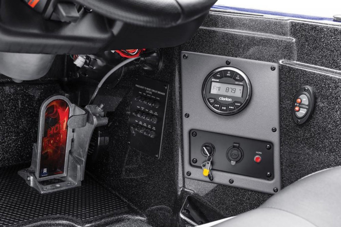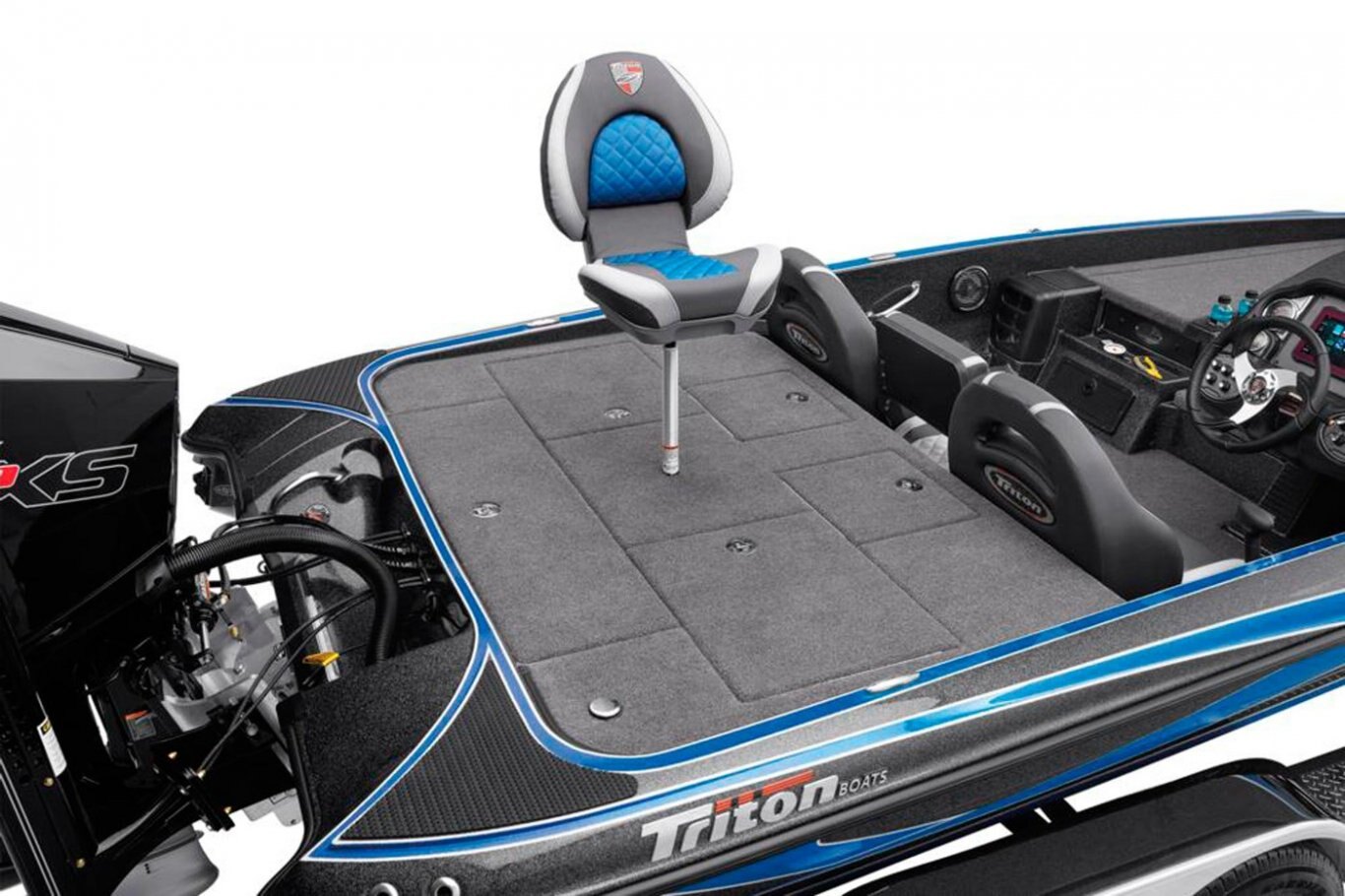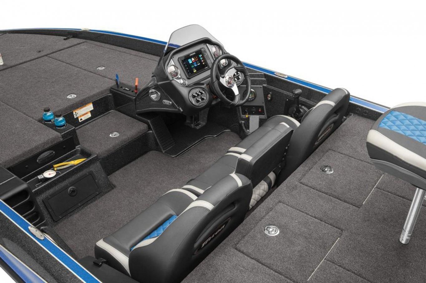 New Deluxe 3-Spoke Steering Wheel w/ Center Cap (10) Standard Color Schemes to Choose From (4) Premium Color Packages to Choose From Center Console with Fiberglass Lid Extended Leg-Room Driver's Console Tilt steering Dual Pro On Board Charger 15 x 4 Stainless Steel Bow and Transom Eyes Stainless Steel Pull-Up Cleats Built-in Ice-Chest in Front-Deck Step Stainless steel drink holders Removable Windshield Newly Restyled Adjustable Driver and Passenger Suspension Bucket Seats Stainless Steel Prop Chrome Fuel Fill Remote drain plug Front Deck Carpet Padding Trolling Motor Battery Trays Only Cranking battery with tray Padded Dash with Tachometer, Speedometer, Voltmeter, Fuel, Trim and Water-Pressure Gauge 2 Rod Locker Lid Pistons 2-Storage Box Lid Pistons Engine Trim Lever on the Helm KeelShield® Protector Lucas® Oil Detail Kit