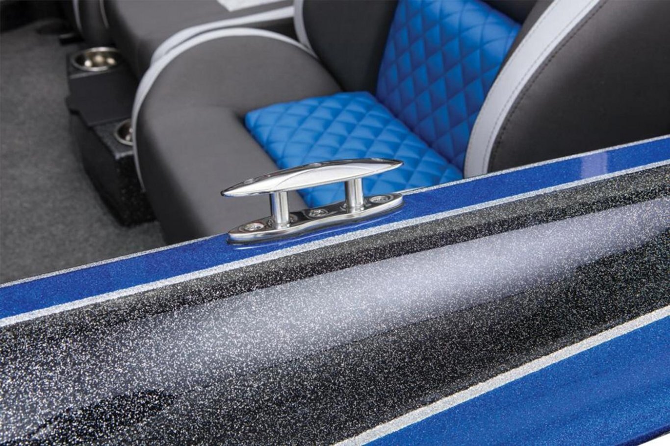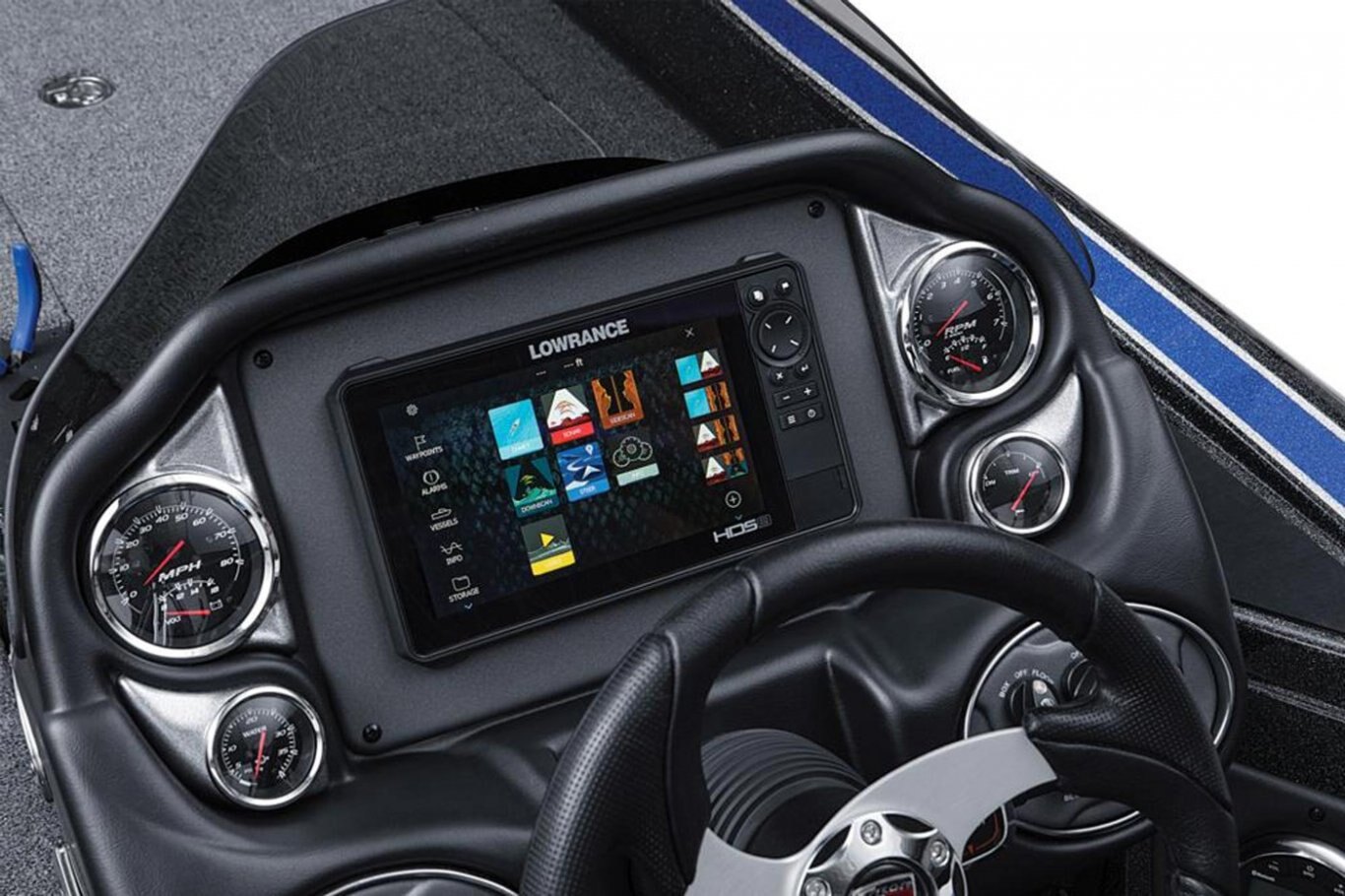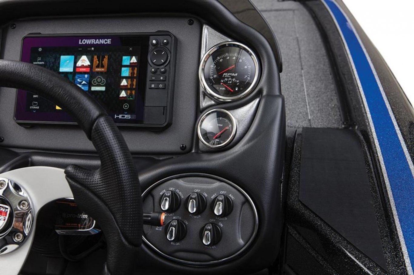 New Deluxe 3-Spoke Steering Wheel w/ Center Cap (10) Standard Color Schemes to Choose From (4) Premium Color Packages to Choose From Center Console with Fiberglass Lid Extended Leg-Room Driver's Console Tilt steering Dual Pro On Board Charger 15 x 4 Stainless Steel Bow and Transom Eyes Stainless Steel Pull-Up Cleats Built-in Ice-Chest in Front-Deck Step Stainless steel drink holders Removable Windshield Newly Restyled Adjustable Driver and Passenger Suspension Bucket Seats Stainless Steel Prop Chrome Fuel Fill Remote drain plug Front Deck Carpet Padding Trolling Motor Battery Trays Only Cranking battery with tray Padded Dash with Tachometer, Speedometer, Voltmeter, Fuel, Trim and Water-Pressure Gauge 2 Rod Locker Lid Pistons 2-Storage Box Lid Pistons Engine Trim Lever on the Helm KeelShield® Protector Lucas® Oil Detail Kit