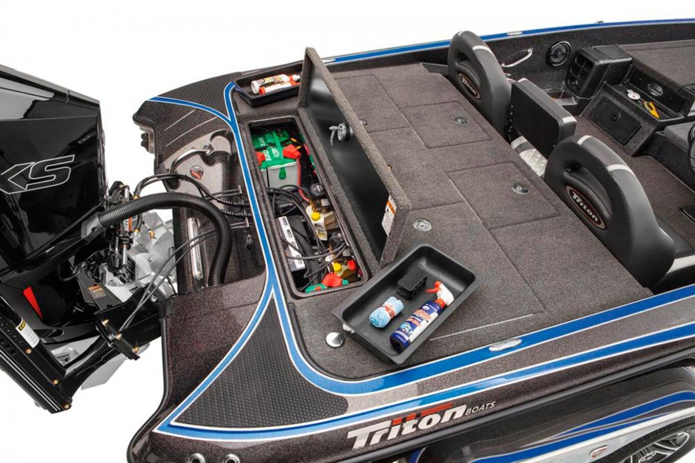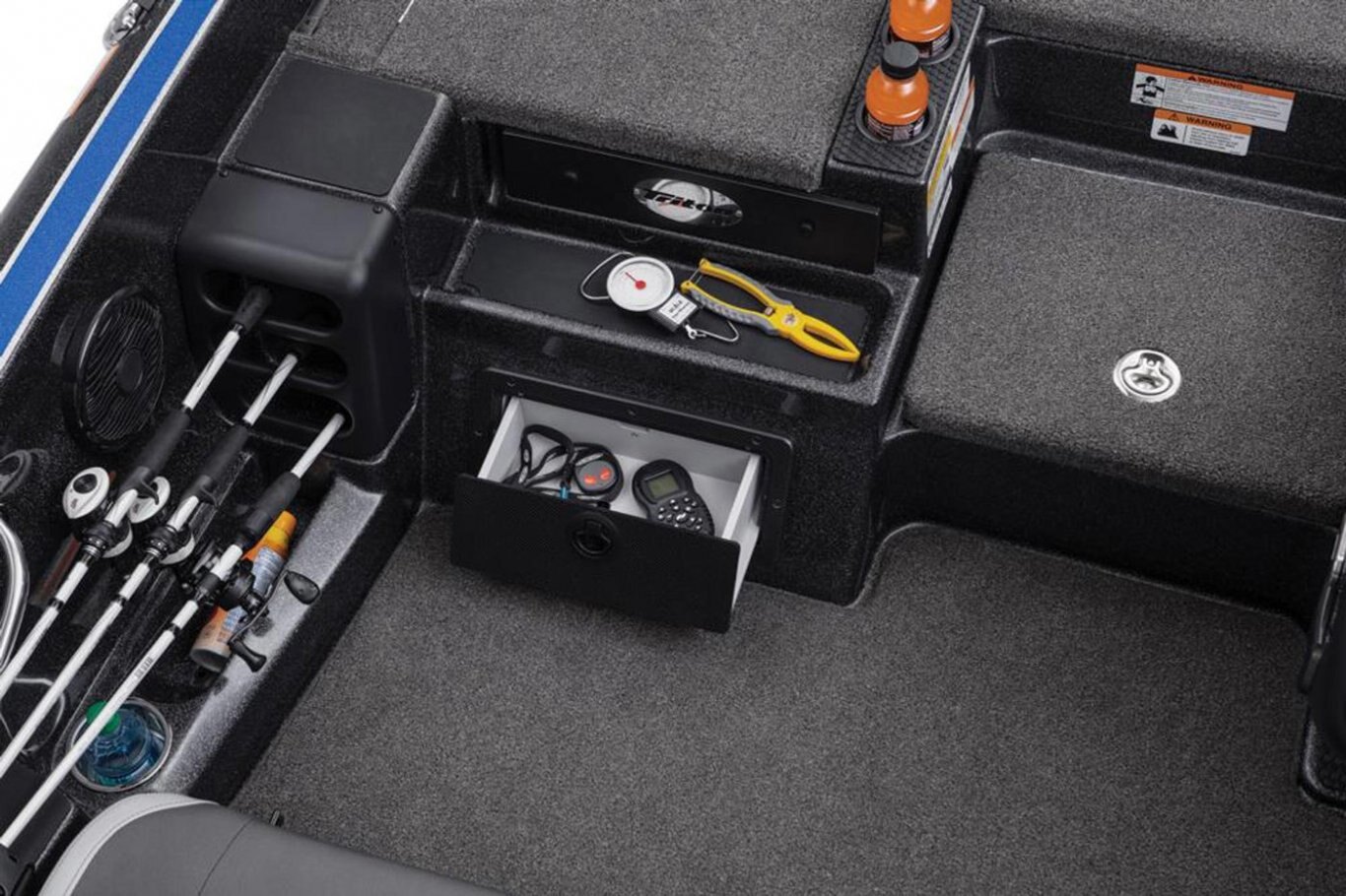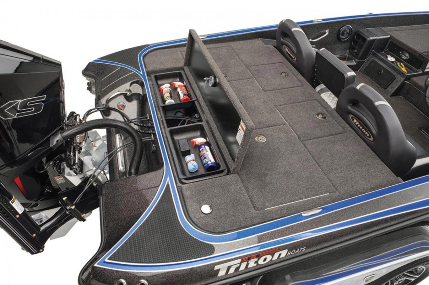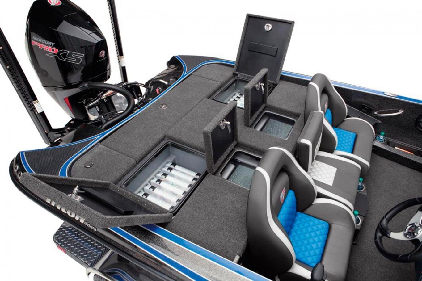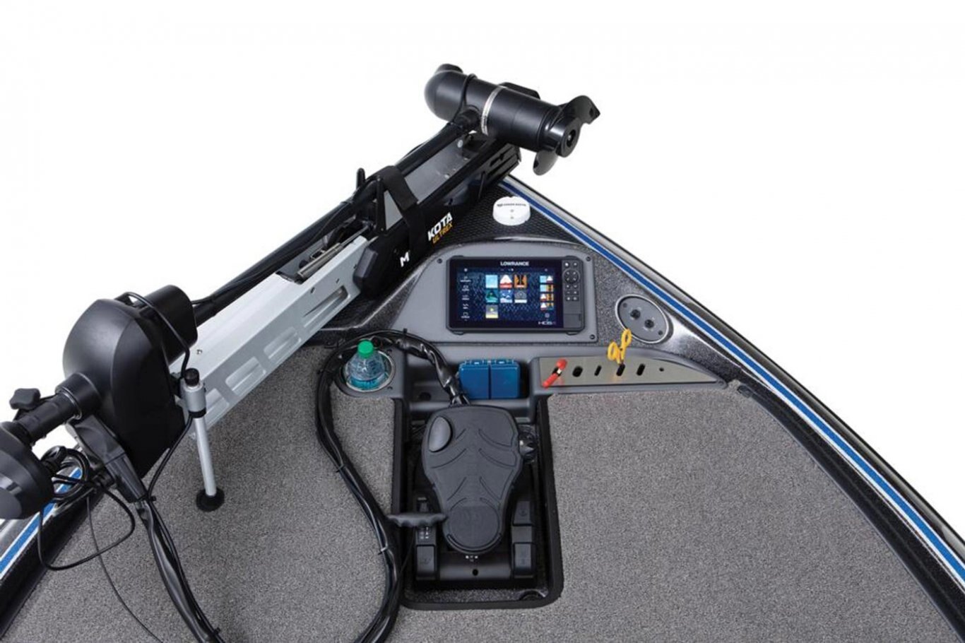 "Stay-Full" Livewell Overflow System 2-800 gph Livewell Aerator Pumps 2-800 gph Livewell Recirculation Pumps 2-800 gph Livewell Pumpouts Tournament Livewell System with Oxygenators in each Livewell Two Hi-Capacity Rear Insulated Livewell with Insulated Lids 1-Bike Seat with Hydraulic Pedestal Seat Pole Centric II™ Pedestal Seat with Mesh Suspension 2-Front Pedestal Locations 3-Retractable Rod Buckles, 2-Bow, 1-Rod Ramp Front Deck Drink/Bait-Holder Bow Trim Switch Built-in Fish Measuring Board with Tool Holder LED Compartment Lights Stainless Steel Capped Fittings Above Rubrail Oversized Rod Lockers Passenger-Side Rod Ramp Locking Oversized Storage Boxes Livewell Aerator Timer Lowrance® HDS 9 LIVE w/ Active Target at Bow Lowrance® HDS 9 LIVE w/ AI at Dash Lowrance® Active Imaging Transducer Lowrance® Ghost 47" 36V trolling motor Port Side 8' Rod-Rack with 12-Rod Capacity Trolling Motor Foot-Control Deck Recess Center Storage Box Tackle Organizing System