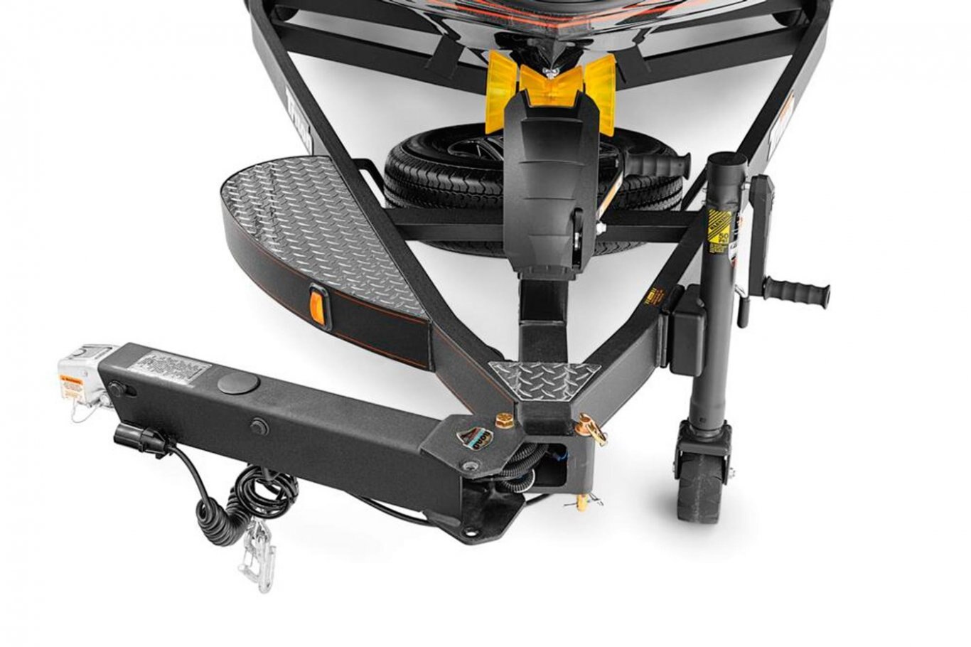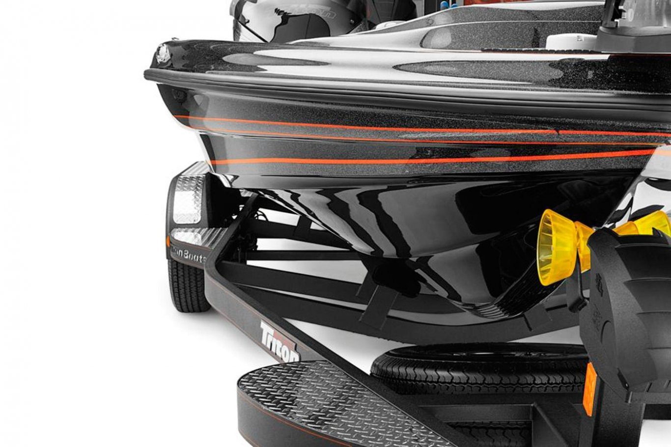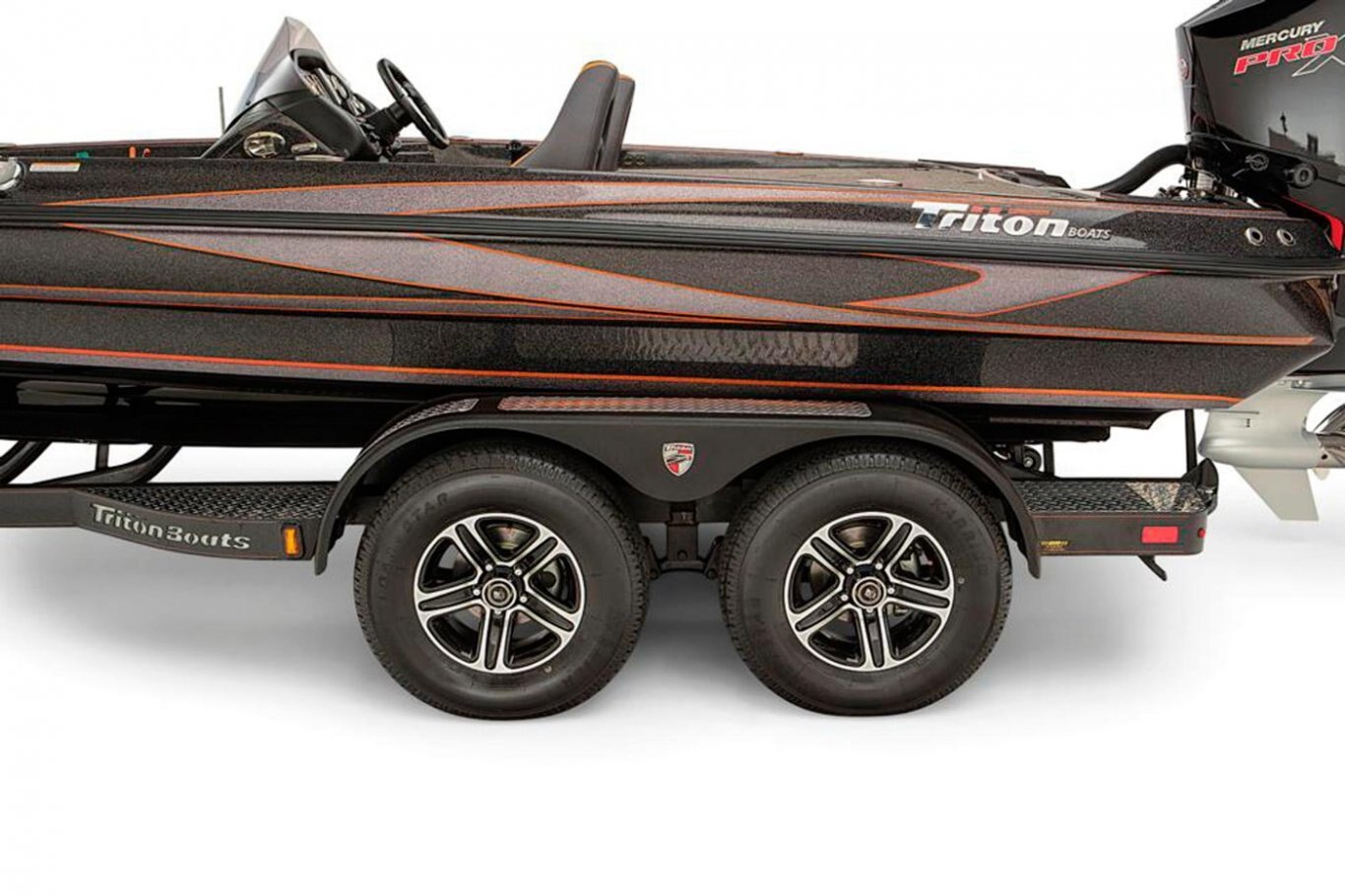 Aluminum Diamond Tread Plate, Front and Rear Step Pads Balanced Radial Tires Custom Aluminum Wheels and Radial Tires Oversized Bow Trailer Step Vault® Hubs with 10 Year Limited Warranty Disc Brakes on All Axles Ratchet Trailer TieDowns Seven Pin Trailer Plug Spare Aluminum Wheel and Radial Tire Spare Tire Mount (Underslung) Tandem Axle DLx Deluxe Winch DLx Deluxe Jack Stand TRITON® Lighted Step Pads Channel Steel Frame Swing Tongue LED Trailer Tail, Marker and Reverse Lights Recessed and Waterproof Lighting Road Armor® Protective Finish
