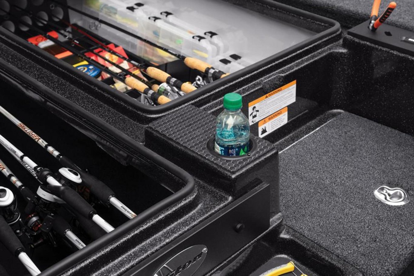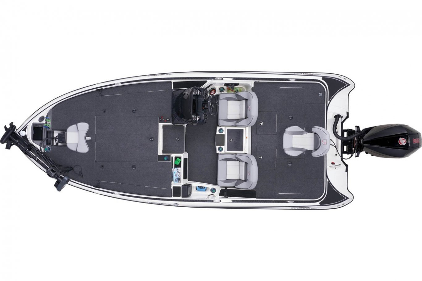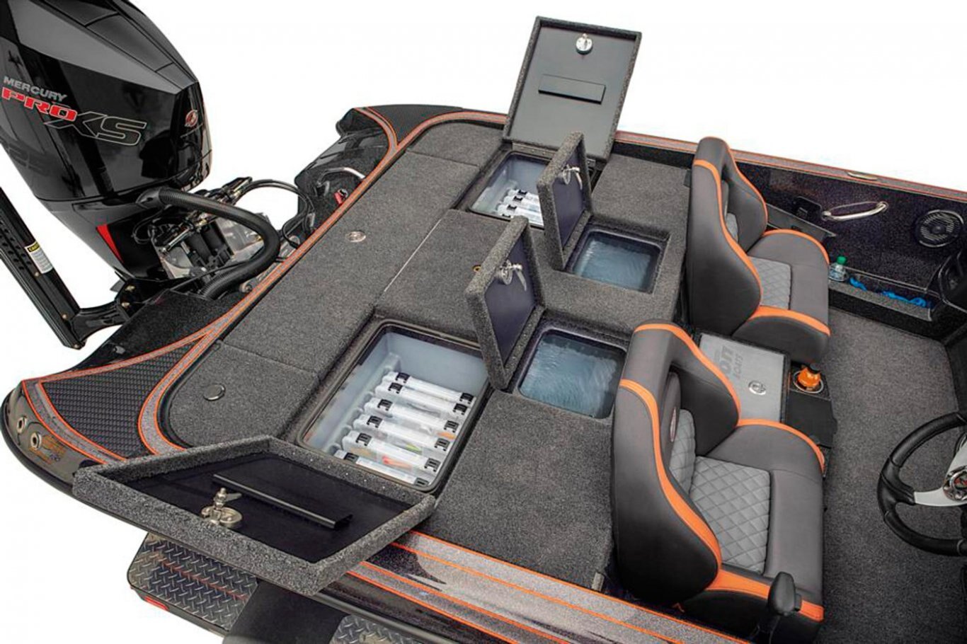 2-800 gph Livewell Aerator Pumps 2-800 gph Livewell Recirculation Pumps 2-800 gph Livewell Pumpouts Tournament Livewell System with Oxygenators in each Livewell Two Hi-Capacity Rear Insulated Livewell with Insulated Lids 1-Bike Seat with Hydraulic Pedestal Seat Pole Centric II™ Pedestal Seat with Mesh Suspension 3-Retractable Rod Buckles, 2-Bow, 1-Rod Ramp Front Deck Drink/Bait-Holder Bow Trim Switch Built-in Fish Measuring Board with Tool Holder Stainless Steel Capped Fittings Above Rubrail Oversized Rod Lockers Passenger-Side Rod Ramp Locking Oversized Storage Boxes Livewell Aerator Timer Lowrance® HDS 9 LIVE w/ Active Target at Bow Lowrance® HDS 9 LIVE w/ AI at Dash Lowrance® Active Imaging Transducer Lowrance® Ghost 47" 36V trolling motor Port Side 8' Rod-Rack with 12-Rod Capacity Trolling Motor Foot-Control Deck Recess Center Storage Box Tackle Organizing System