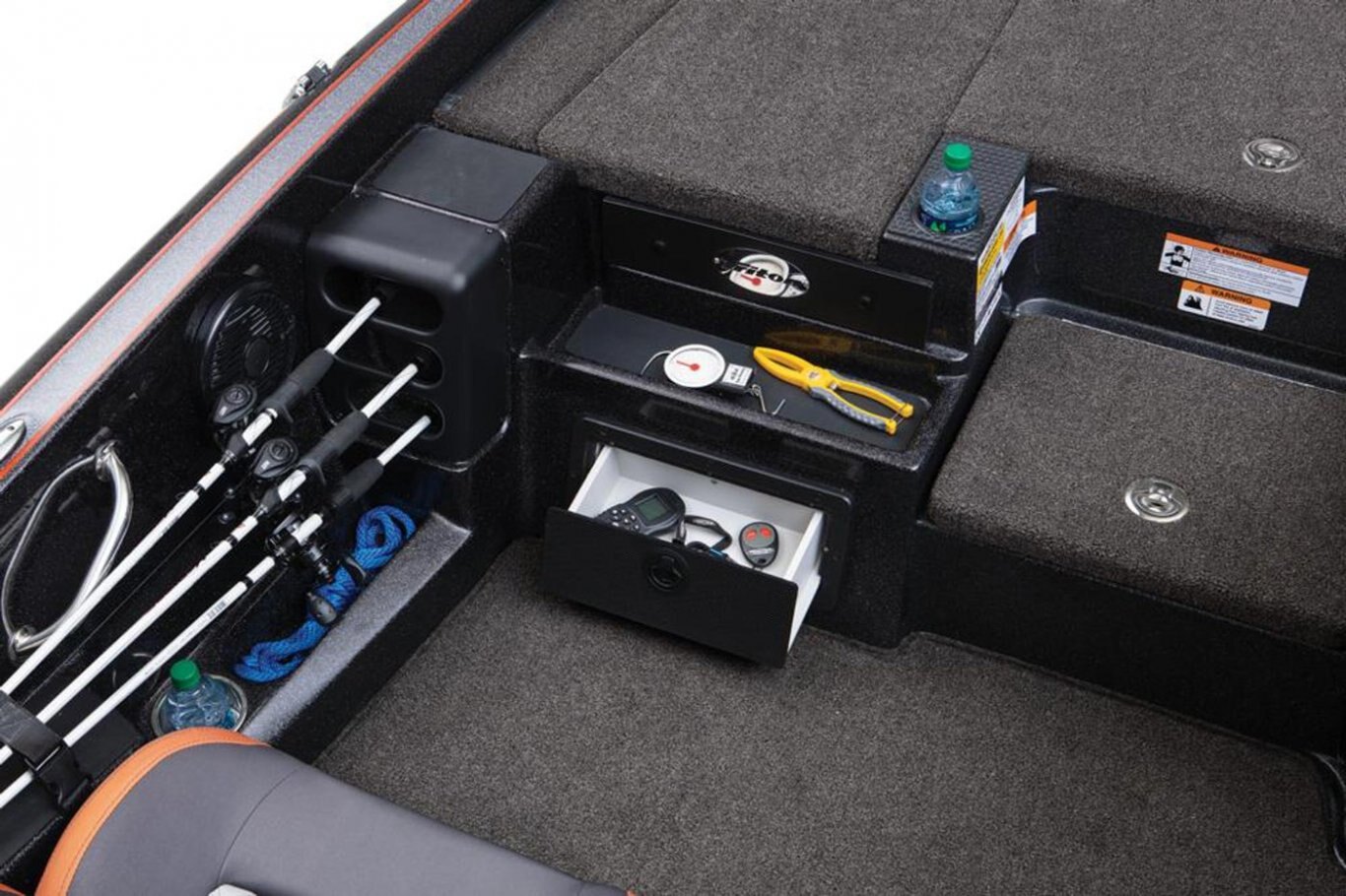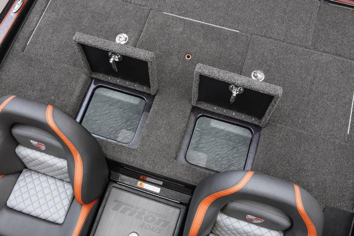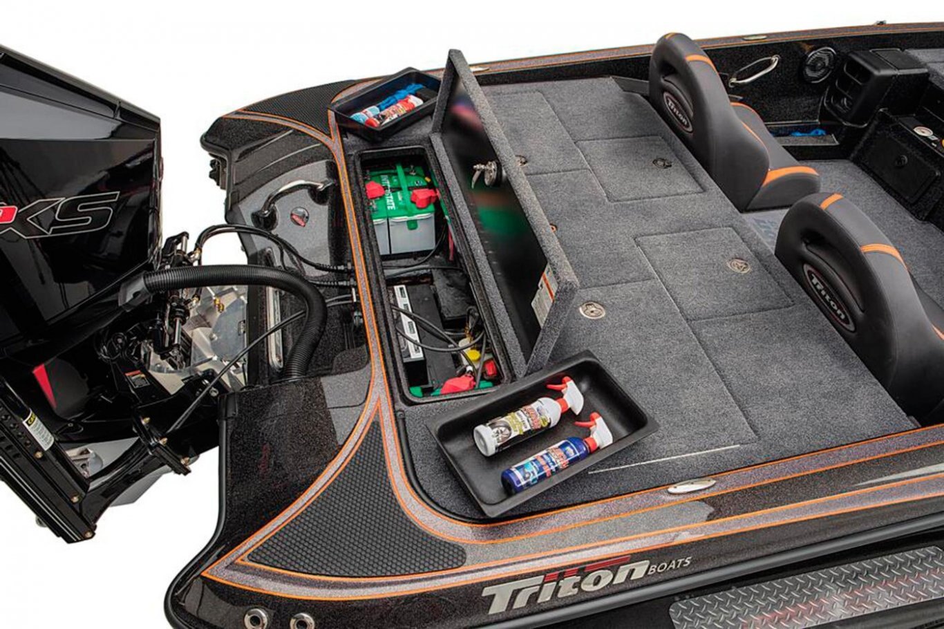 2-800 gph Livewell Aerator Pumps 2-800 gph Livewell Recirculation Pumps 2-800 gph Livewell Pumpouts Tournament Livewell System with Oxygenators in each Livewell Two Hi-Capacity Rear Insulated Livewell with Insulated Lids 1-Bike Seat with Hydraulic Pedestal Seat Pole Centric II™ Pedestal Seat with Mesh Suspension 3-Retractable Rod Buckles, 2-Bow, 1-Rod Ramp Front Deck Drink/Bait-Holder Bow Trim Switch Built-in Fish Measuring Board with Tool Holder Stainless Steel Capped Fittings Above Rubrail Oversized Rod Lockers Passenger-Side Rod Ramp Locking Oversized Storage Boxes Livewell Aerator Timer Lowrance® HDS 9 LIVE w/ Active Target at Bow Lowrance® HDS 9 LIVE w/ AI at Dash Lowrance® Active Imaging Transducer Lowrance® Ghost 47" 36V trolling motor Port Side 8' Rod-Rack with 12-Rod Capacity Trolling Motor Foot-Control Deck Recess Center Storage Box Tackle Organizing System