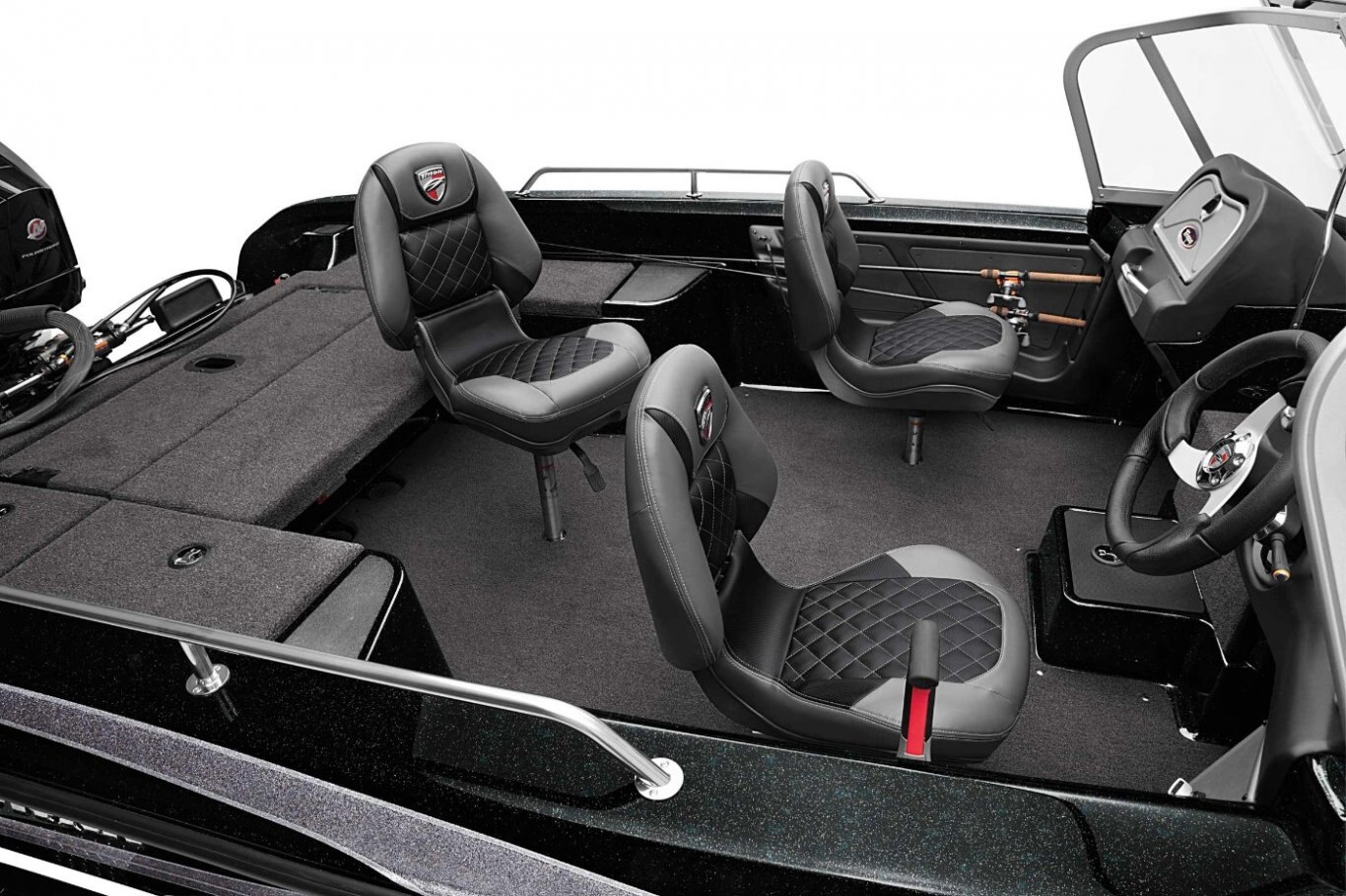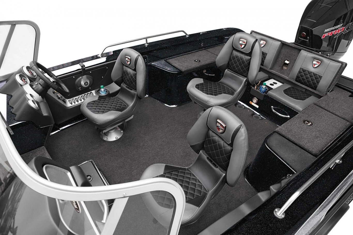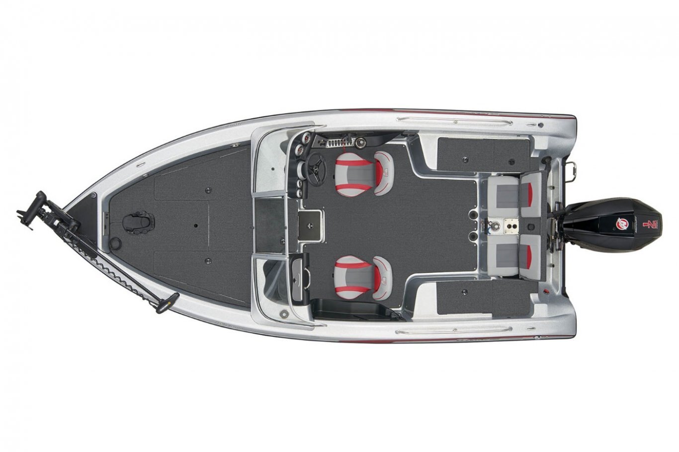 New - Deluxe 3-Spoke Steering Wheel with Center Cap Dual Pro On Board Charger 15 x 3 (10) Standard Color Schemes to Choose From Extended Leg-Room Driver's Console Newly Restyled - 3 folding SAS Seats: 1 Driver Seat, 1 Passenger Seat, and 1 Pedestal Seat Clarion MM20 Stereo with 2 Speakers Passenger Console with Glove Box Padded Dash with Tachometer, Speedometer, Fuel and Trim Nitrogen Lid Lifts Stainless Steel Bow and Transom Eyes Stainless Steel Pull-Up Cleats Folding Rear Bench Seat Non-Skid Fiberglass Cockpit Flooring Stainless Steel Passenger Drink Holder Stainless Steel Prop Remote drain plug Trolling Motor Battery Trays Only Cranking battery with tray