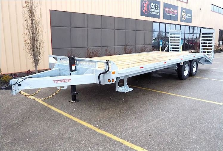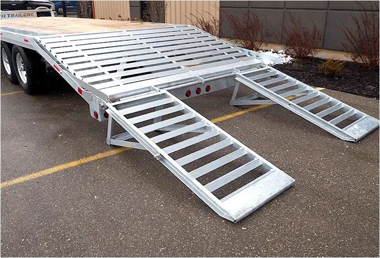 • 5200 and 7000 LB axles • Both axles electric brakes • 225/75R15 and 235/80R16 wheels • Easy lube hubs • 8" C Channel frame • 8” C Channel tongue that runs all the way to back of trailer • 3" C channel cross members 16" centers • 2 5/16" adjustable coupler • LED lights • Galvanized coating • Hardwood decking • Rub rail and stake pockets on sides of trailer • Heavy Duty stand up ramps • Standard beavertails 5' long • 12K jack • Winch plate