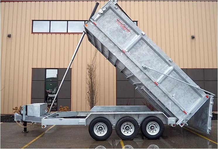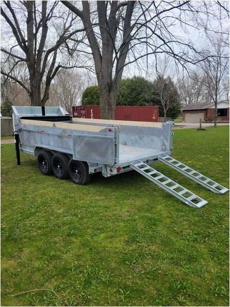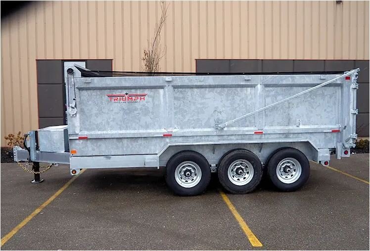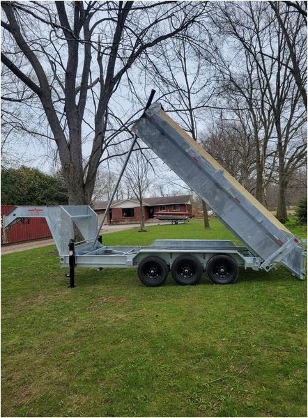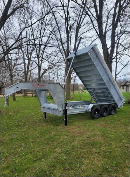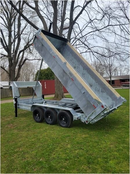 • 7000 LB axles • All axles with electric brakes • 235/80R16 wheels • Radial tires • Easy lube hubs • Hinge pins zinc plated • 7 and 12 ton telescopic cylinders • Dump at a minimum of 46 degrees • 4" drop axles • 12k drop down jack • All Hinges, pins have grease fittings • Deep cycle battery • Barn door/spreader gate • Steel tool box with lid stay and locking latch • Power up gravity down pump • 8" C Channel up to 10" I beam frame • 3" C channel floor 16" centers • Double wall for strength and no damage on exterior wall • 11 gauge (.125) inner wall 14 gauge (.083) outer wall • 7 gauge (.188) floor • 2 5/16" adjustable coupler • LED lights • Galvanized finish (paint on request) • 8-10 heavy duty D-rings recessed inside of dump • 28" deep sides • Tarp kit built in house, fitted with bearings • Dump prop • Drop legs • Board extension
