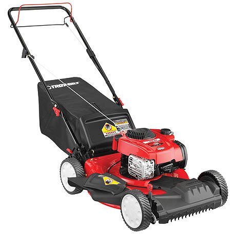 Troy-Bilt's TB200 self-propelled mower is equipped with an easy-to operate front wheel drive transmission, rear bag, mulch and side discharge option and a 150cc* Briggs and Stratton® engine. Featuring the innovative TriAction® cutting system, this self-propelled lawn mower is complete with a rake bumper to lift grass upright, a specially designed blade for a finer mulch and a symmetrical deck for superior grass flow, eliminating clumping.