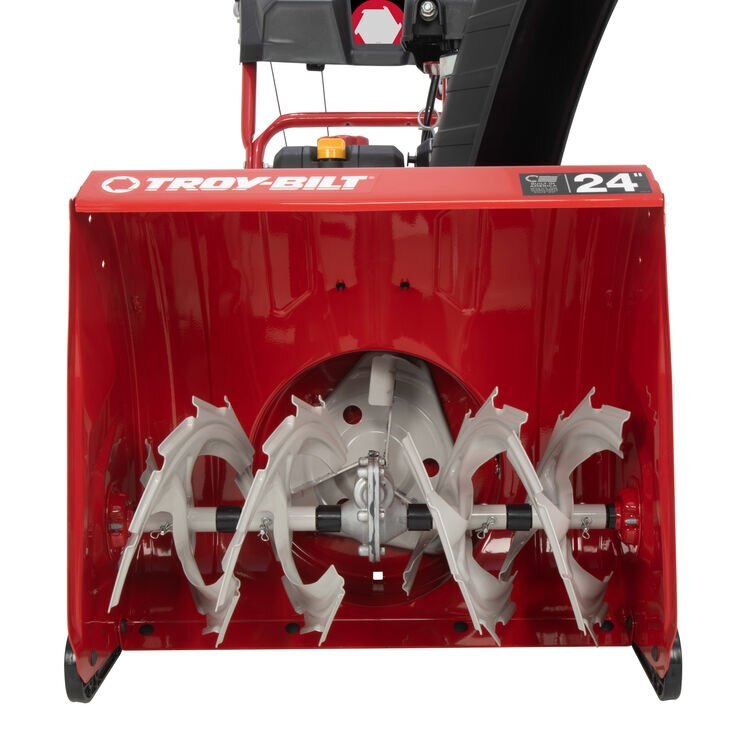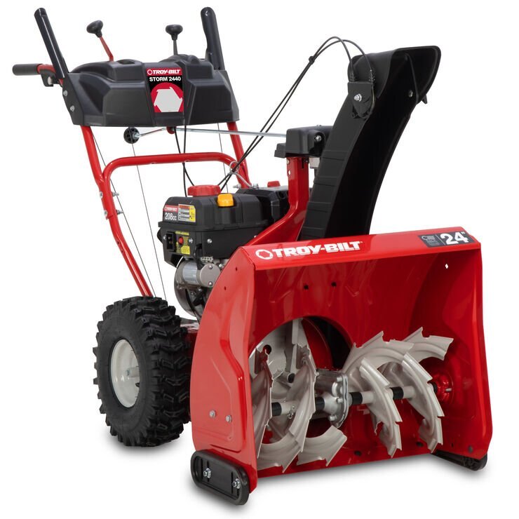 The Troy-Bilt Storm 2440 brings the power and convenience you need to make clearing snow less of a hassle. Designed with powerful serrated augers that make quick work of heavy, icy snow. Airless 15" x 5" tires provide strong traction and never go flat, reducing maintenance. A center-mount chute crank puts the machine’s controls comfortably within your reach. Change the height of snow discharge from the dashboard with a remote pitch control lever, and you can adjust chute controls without disengaging the drive thanks to Just One Hand™ operation. The extended chute design minimizes blowback of snow discharge on the operator. The Storm 2440 can handle up to 12" of snowfall with a reliable 208cc Troy-Bilt engine that starts at the push of a button, making sure winter won’t keep you from doing what you love most.