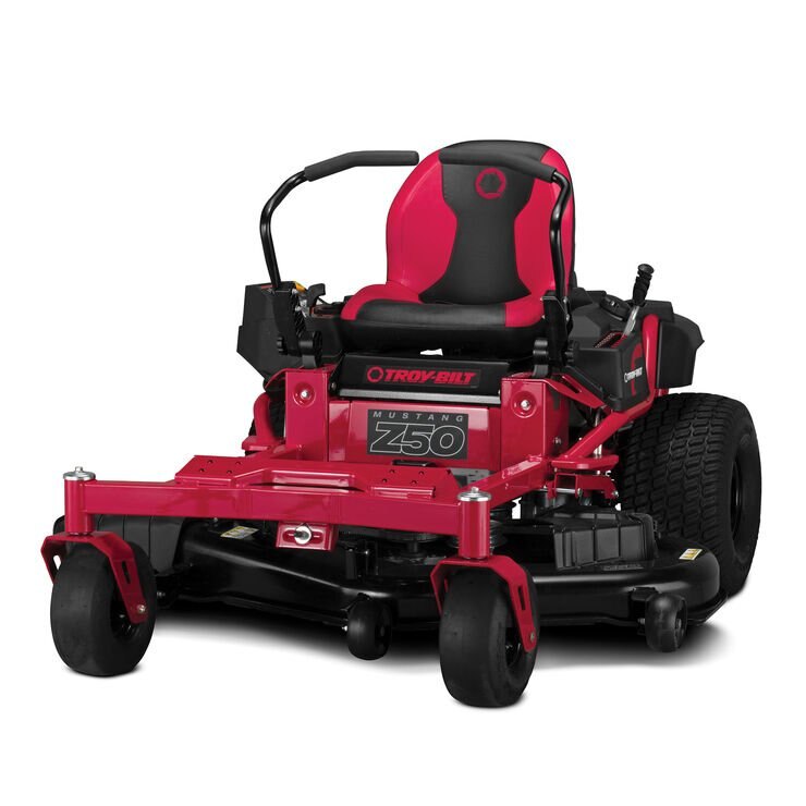 The Mustang Z50 with 50-in cutting deck moves easily across yard with the added support of deck wheels and a front roller to smooth over bumps. You'll get dependable starting and performance with powerful Troy-Bilt engine and a more comfortable ride with the adjustable high back seat.