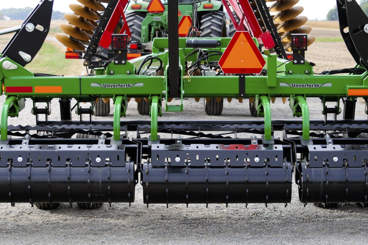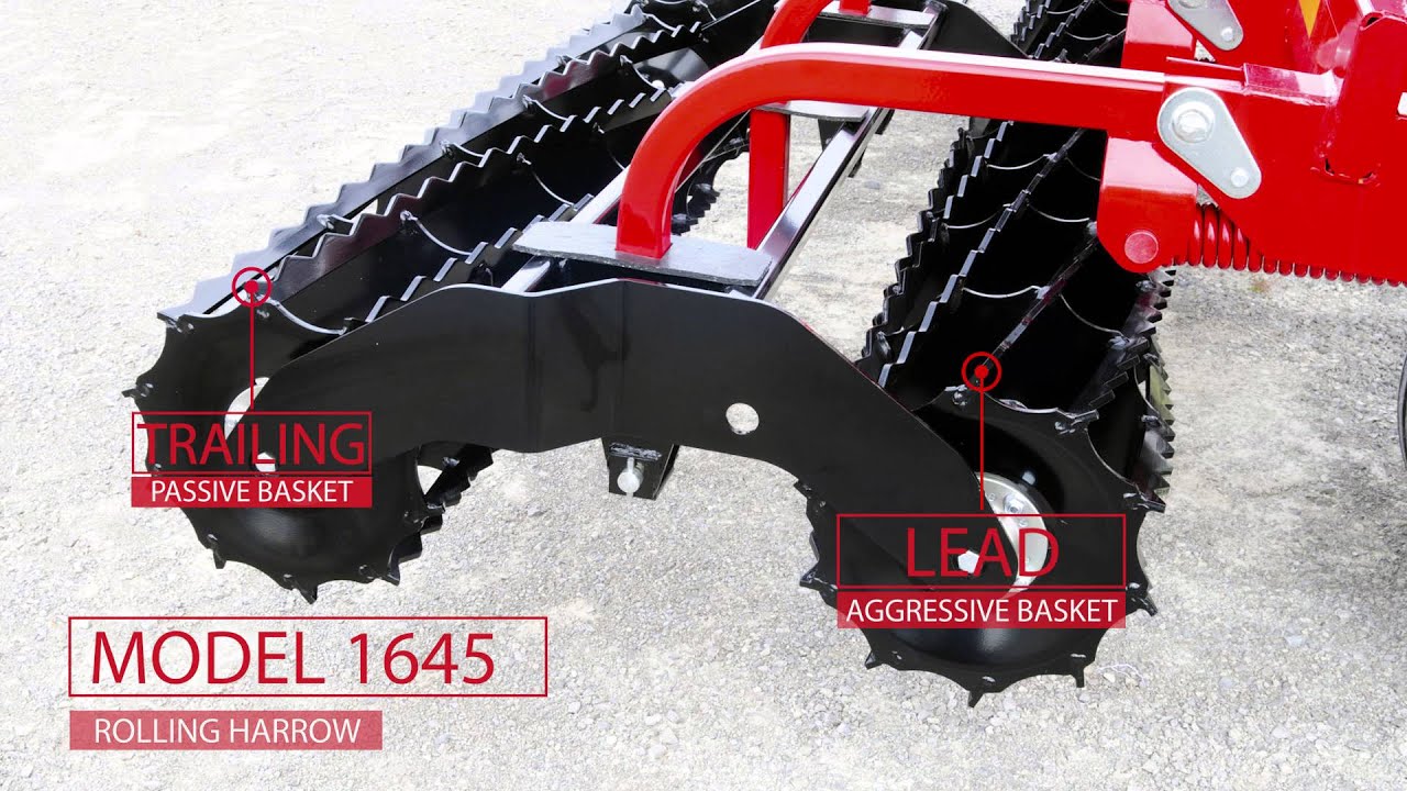 The model 1645D Rolling Harrow® features aggressive 16" diameter front rolling baskets with scalloped and pitched blades for breaking up larger clods. The 16" diameter rear rolling drum pushes down rocks and enhances soil firming. The 1645D is specifically designed for high-speed soil finishing behind field cultivators, discs and vertical tillage tools. |