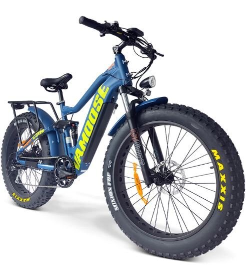 The Super ODIN Xi is a full suspension, 52V 750W mountain crusher, with a torque sensor, 4.8" MAXXIS tires, and a monster 52V 20Ah battery. The Super ODIN Xi mountain bike brings enjoyment to trails full of bumps and chatter. With its UPGRADED impact-reducing front and rear shocks that bear the brunt of trail impacts, the Super ODIN Xi has been designed to dramatically reduce the impact on the rider while increasing traction and creating a very forgiving and enjoyable ride. Equipped standard with hydraulic disc brakes, fenders, and rear rack, the Vamoose Super ODIN Xi comes exceptionally well-appointed.