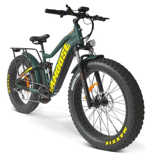 The Super ODIN Xi is a full suspension, 52V 750W mountain crusher, with a torque sensor, 4.8" MAXXIS tires, and a monster 52V 20Ah battery. The Super ODIN Xi mountain bike brings enjoyment to trails full of bumps and chatter. With its UPGRADED impact-reducing front and rear shocks that bear the brunt of trail impacts, the Super ODIN Xi has been designed to dramatically reduce the impact on the rider while increasing traction and creating a very forgiving and enjoyable ride. Equipped standard with hydraulic disc brakes, fenders, and rear rack, the Vamoose Super ODIN Xi comes exceptionally well-appointed.