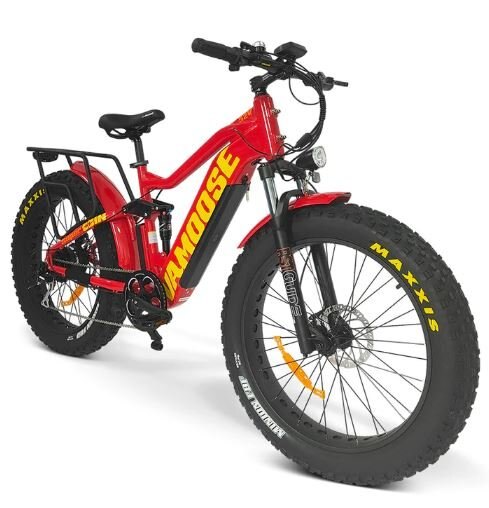 The Super ODIN Xi is a full suspension, 52V 750W mountain crusher, with a torque sensor, 4.8" MAXXIS tires, and a monster 52V 20Ah battery. The Super ODIN Xi mountain bike brings enjoyment to trails full of bumps and chatter. With its UPGRADED impact-reducing front and rear shocks that bear the brunt of trail impacts, the Super ODIN Xi has been designed to dramatically reduce the impact on the rider while increasing traction and creating a very forgiving and enjoyable ride. Equipped standard with hydraulic disc brakes, fenders, and rear rack, the Vamoose Super ODIN Xi comes exceptionally well-appointed.