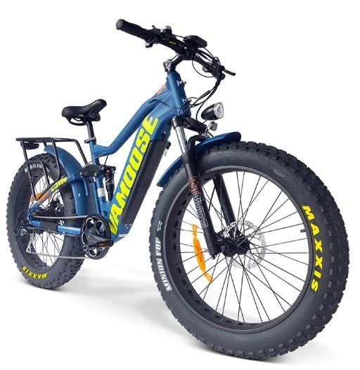 The Super ODIN Xi is a full suspension, 52V 750W mountain crusher, with a torque sensor, 4.8" MAXXIS tires, and a monster 52V 20Ah battery. The Super ODIN Xi mountain bike brings enjoyment to trails full of bumps and chatter. With its UPGRADED impact-reducing front and rear shocks that bear the brunt of trail impacts, the Super ODIN Xi has been designed to dramatically reduce the impact on the rider while increasing traction and creating a very forgiving and enjoyable ride. Equipped standard with hydraulic disc brakes, fenders, and rear rack, the Vamoose Super ODIN Xi comes exceptionally well-appointed.
