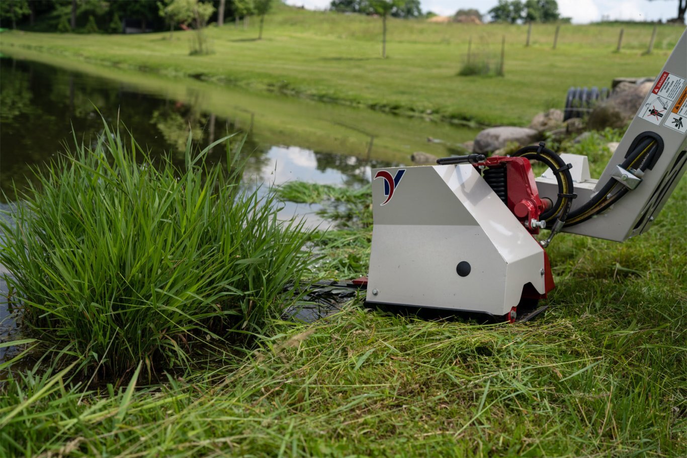 The cutting head of the boom mower is a double action sickle bar which is excellent at cutting a wide variety of material and in different positions. Thin native grasses, cat-tails, shrubs and hedges, or even tree branches are all easily cut with the sickle head. |