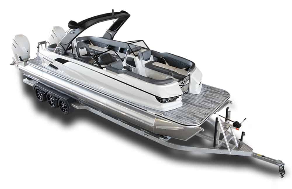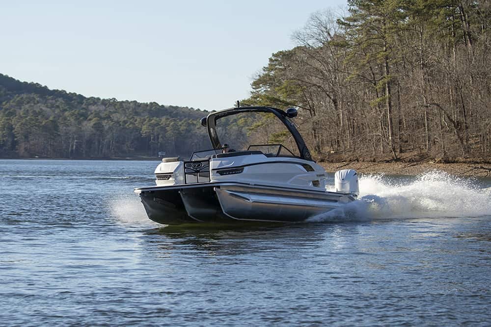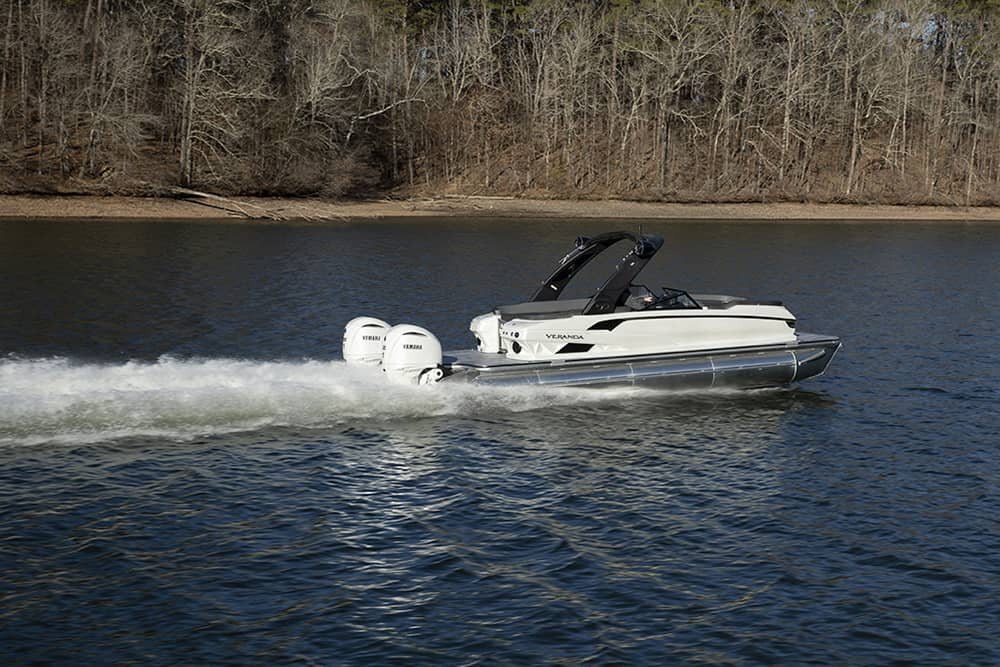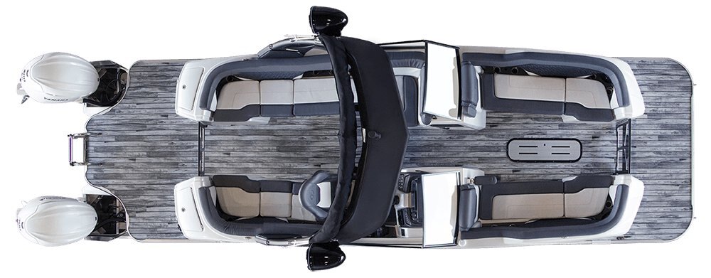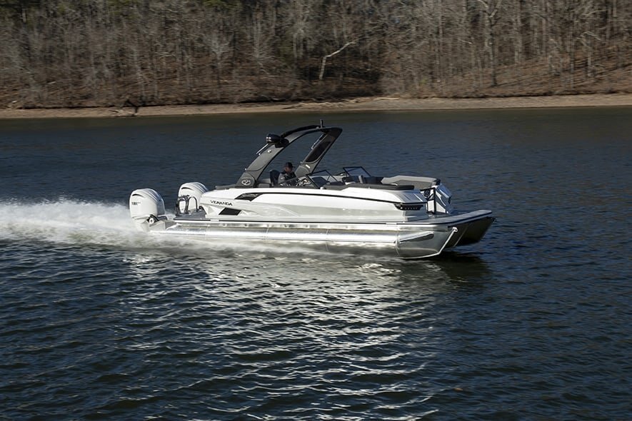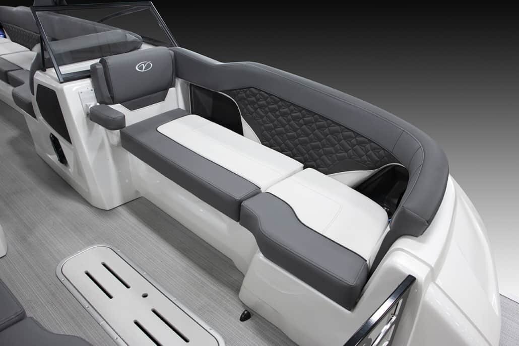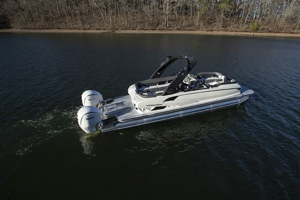 V One. The instant a pilot reaches that critical “V” speed is the moment your heart beats faster and excitement and exhilaration begin to take flight. Imagine yourself at the helm of Veranda Luxury Pontoons 25’ tri-toon flagship. The striking fiberglass exterior will turn heads on the lake, while the geometrically patterned interior upholstery will transform your passengers’ stress and worry into utter bliss. Experience the engineering accuracy of construction and the impeccable pairing of state-of-the-art audio, lighting, and navigational features positioned on top of our Patented All-Aluminum All-Welded Interlocking Floor System. The control tower is calling. Are you ready to take flight?