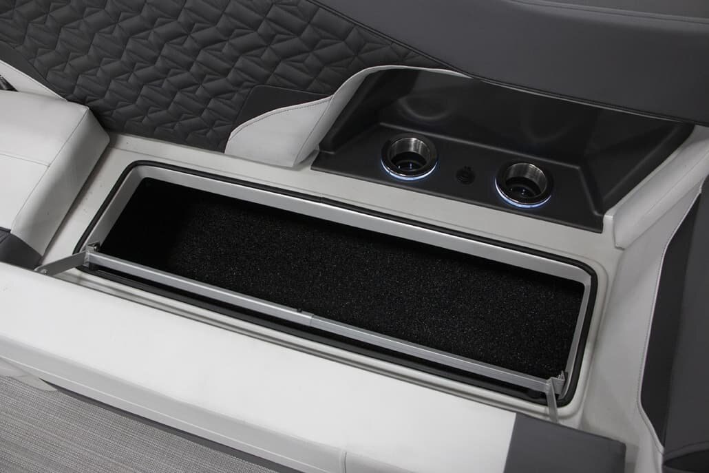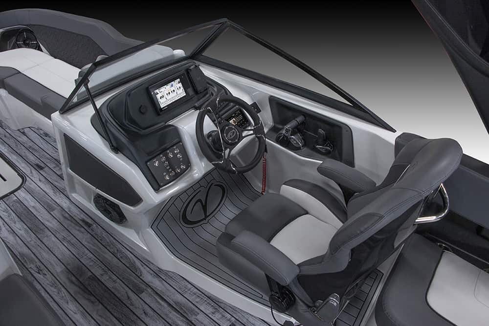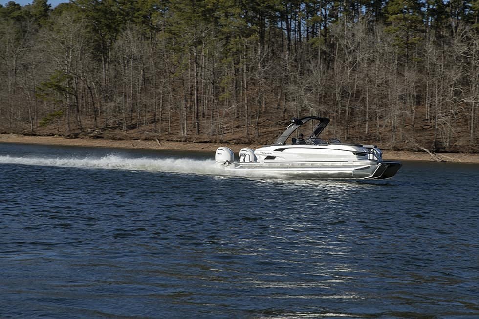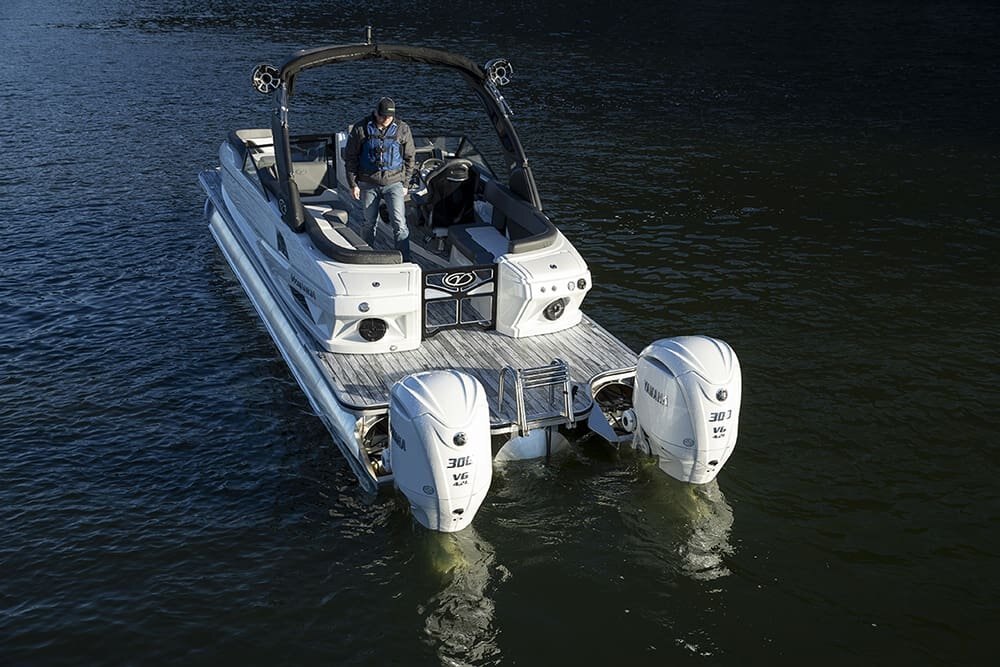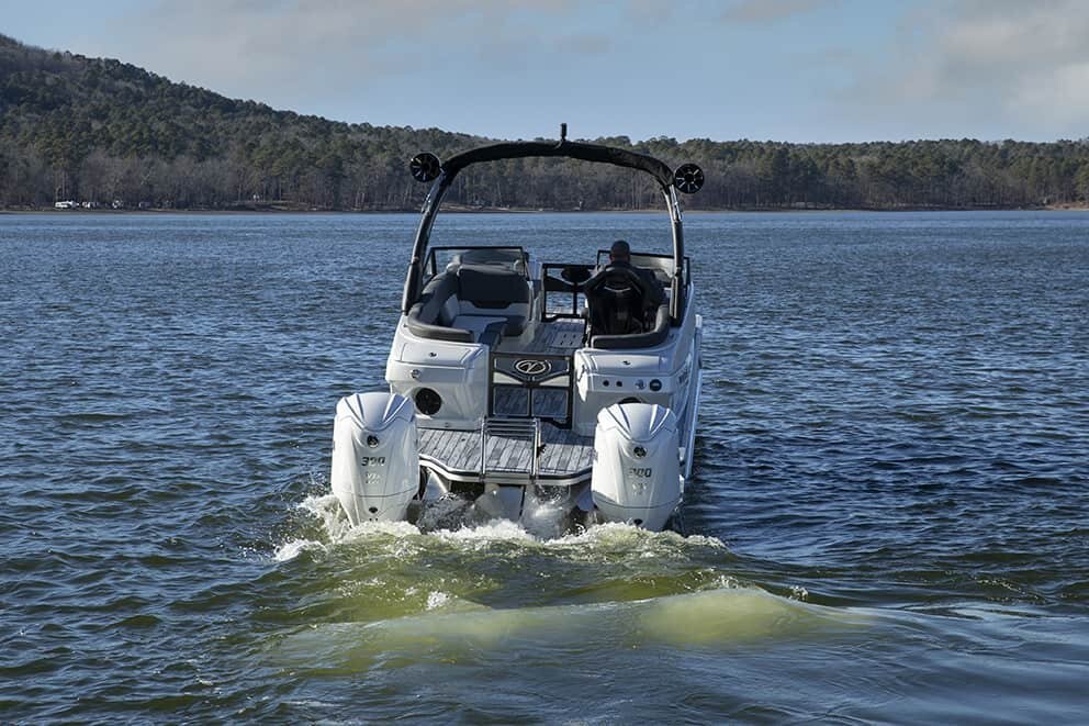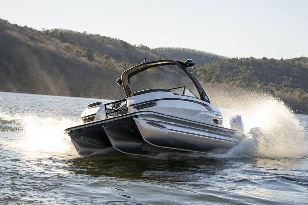 V One. The instant a pilot reaches that critical “V” speed is the moment your heart beats faster and excitement and exhilaration begin to take flight. Imagine yourself at the helm of Veranda Luxury Pontoons 25’ tri-toon flagship. The striking fiberglass exterior will turn heads on the lake, while the geometrically patterned interior upholstery will transform your passengers’ stress and worry into utter bliss. Experience the engineering accuracy of construction and the impeccable pairing of state-of-the-art audio, lighting, and navigational features positioned on top of our Patented All-Aluminum All-Welded Interlocking Floor System. The control tower is calling. Are you ready to take flight?