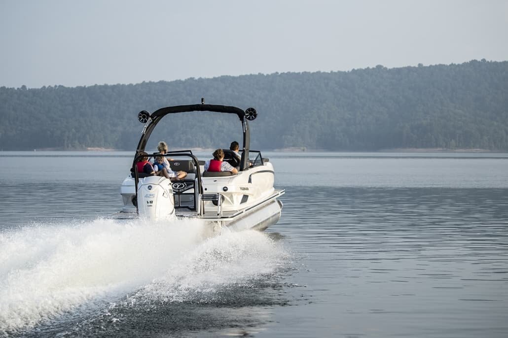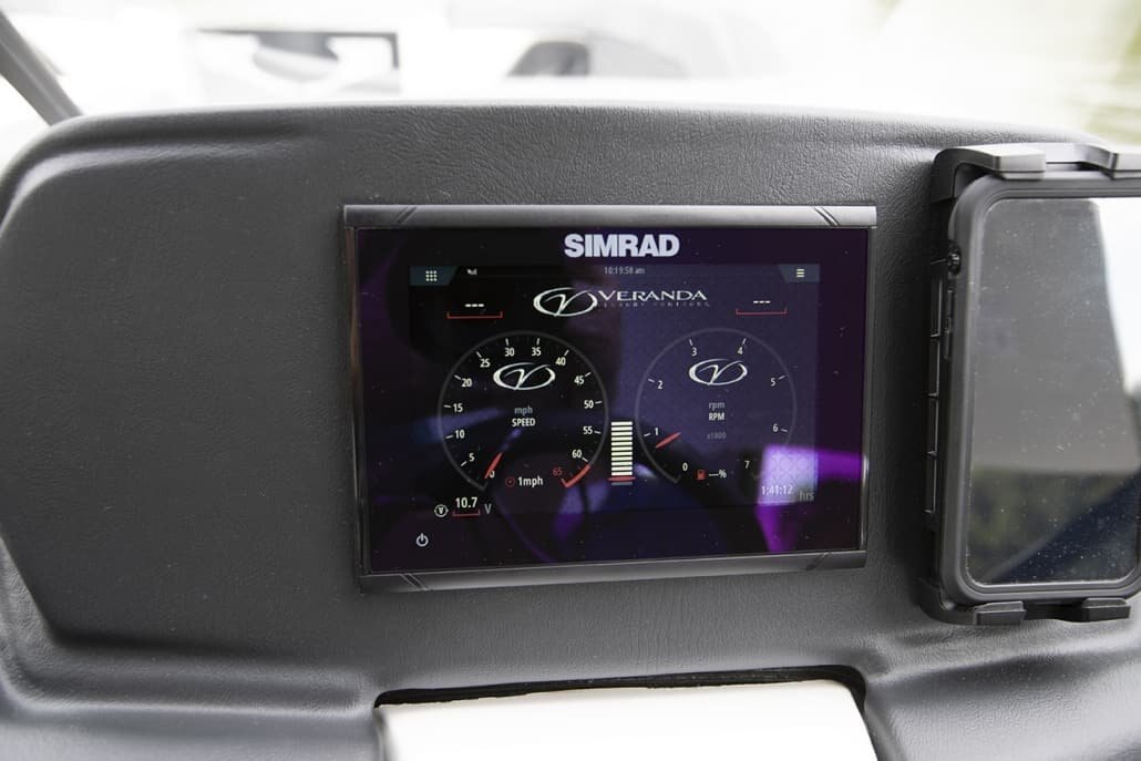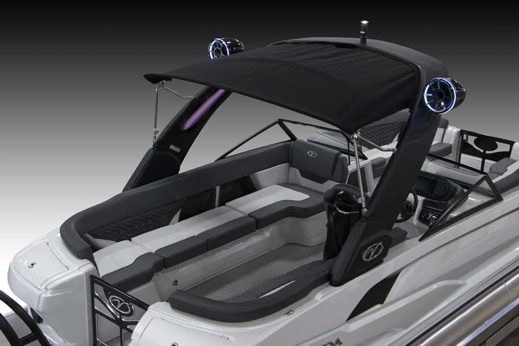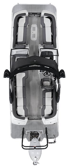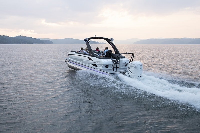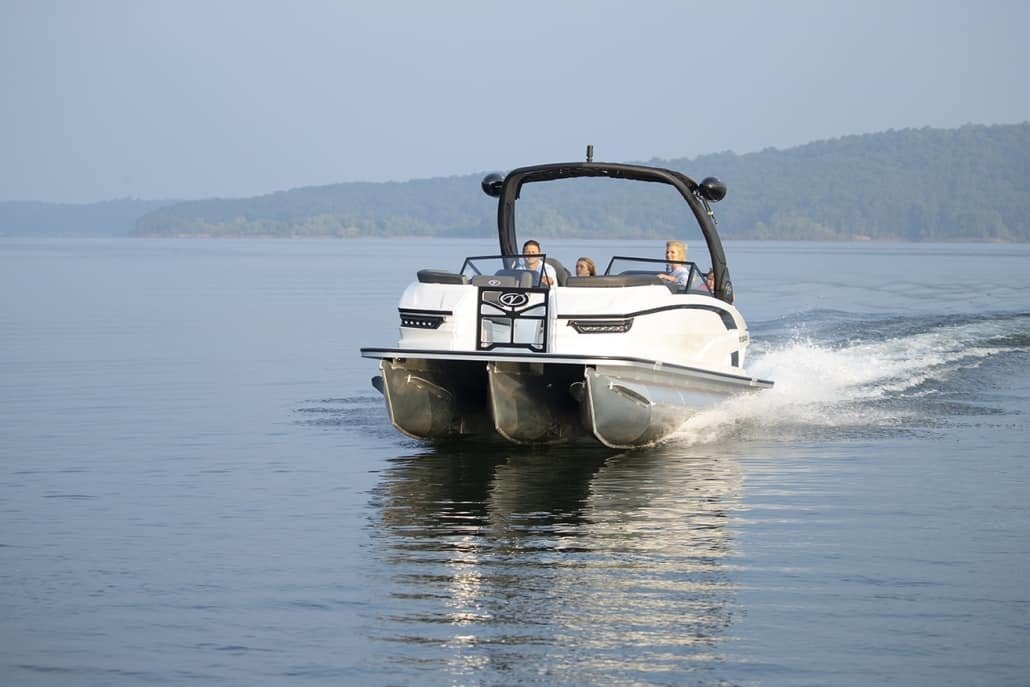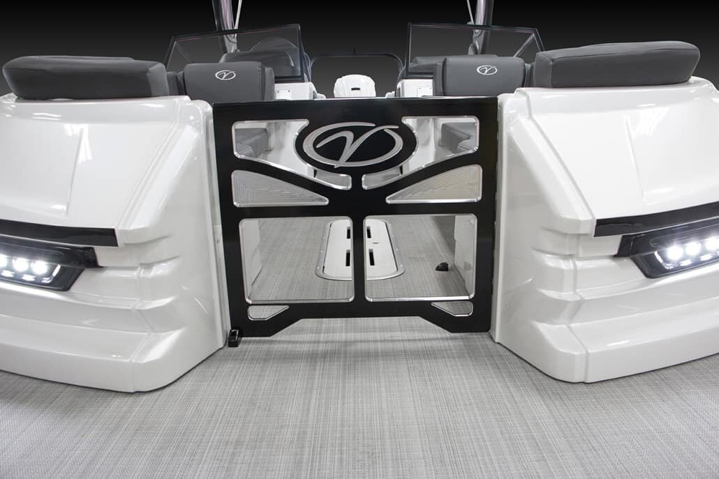 V One. The instant a pilot reaches that critical “V” speed is the moment your heart beats faster and excitement and exhilaration begin to take flight. Imagine yourself at the helm of Veranda Luxury Pontoons 25’ tri-toon flagship. The striking fiberglass exterior will turn heads on the lake, while the geometrically patterned interior upholstery will transform your passengers’ stress and worry into utter bliss. Experience the engineering accuracy of construction and the impeccable pairing of state-of-the-art audio, lighting, and navigational features positioned on top of our Patented All-Aluminum All-Welded Interlocking Floor System. The control tower is calling. Are you ready to take flight?