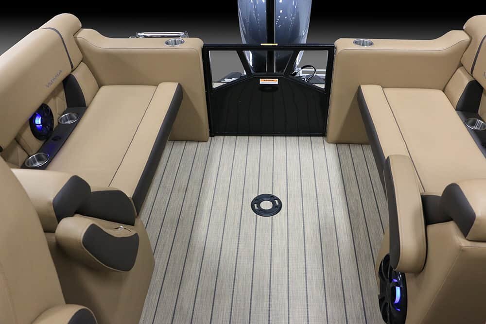 Customers will fall in love with the redesigned Vertex seating, with all-new Cirrus Grey and Cacao Tan vinyl colors and PREMIUM CHIL™ COOL vinyl colors Cognac, Black, and Anthracite, plush marine-grade sculpted foam cushions, and elevated Wet Sounds back-lit cabin speakers. |